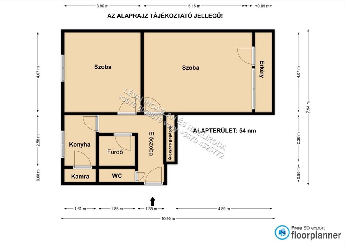 Az ingatlan helyiségei: előszoba, 2 külön nyíló szoba, konyha, kamra, fürdőszoba, külön wc és erkély.