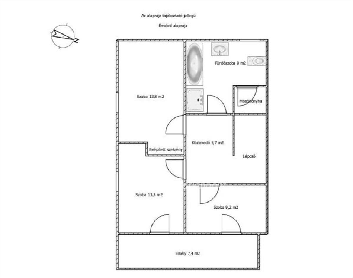 -Tágas fürdőszoba épített zuhannyal és káddal, innen nyílik a külön mosókonyha és kazán helyiség.