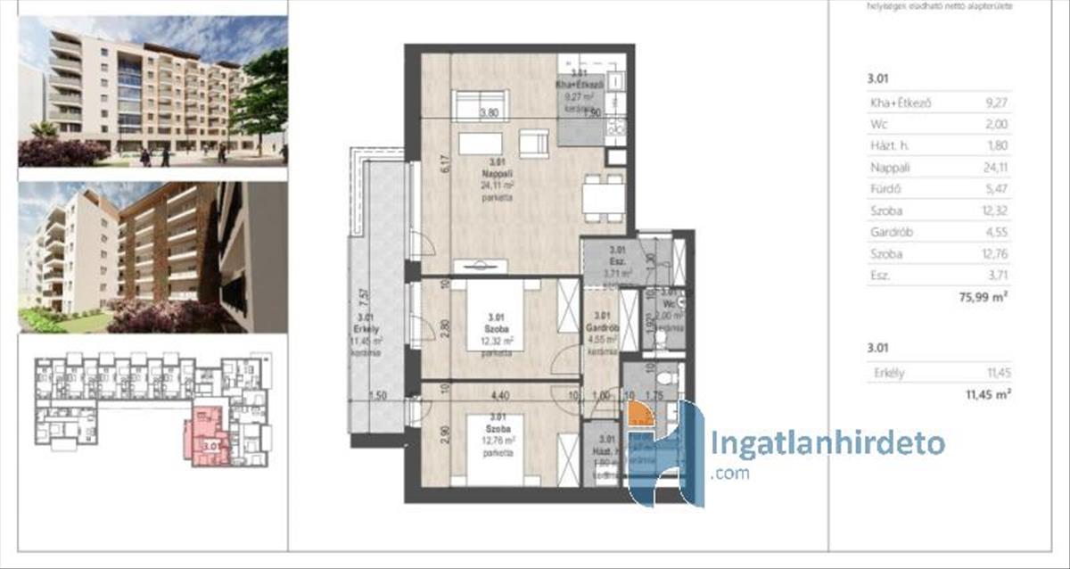 Elhelyezkedése: Társasház Emeleti elhelyezkedés: Emeleten Emelet száma: 3 Épület emeleteinek száma: 7 Tájolása: Déli tájolású Állapota: új Komfort besorolása: összkomfortos Építési éve: 2027 Alapterülete: 76 m2 Szobák száma: 3szoba Közművek: Víz, Villany, Csatorna Fűtés típusa: Padlófűtés, Fan-coil, Hőszivattyú Homlokzat állapot: új Építési mód: Tégla Parkolási lehetőség: Garázsban Kilátás: Udvari kilátás Napelem: Nincs Jellemzői: Alacsony rezsi, Csendes környék, Jó közlekedés Energetikai besorolás: a+ Egyéb jellemzők: Erkély, Lift Tv, Internet: Kábeltévé, Internet Terhelések: Tehermentes ingatlan Eladásra vonatkozó információk: Kizárólag magánszemélyek jelentkezését várjuk