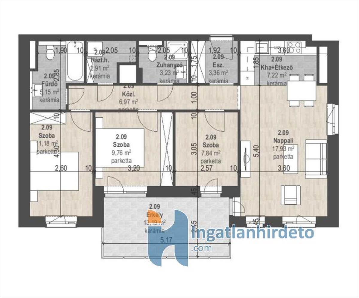 - fűtése: levegős hőszivattyús rendszer (padlófűtés, Fan-coil hűtés)