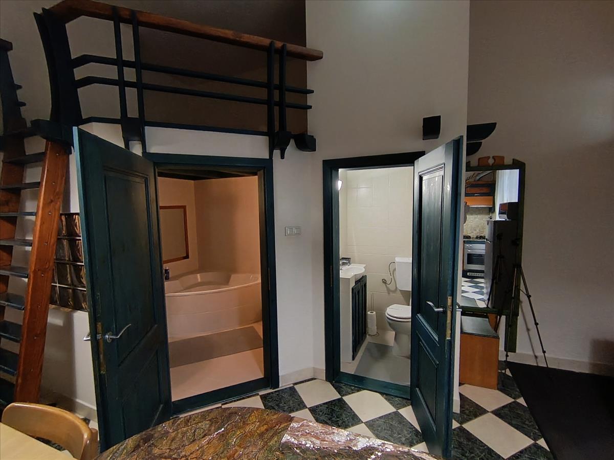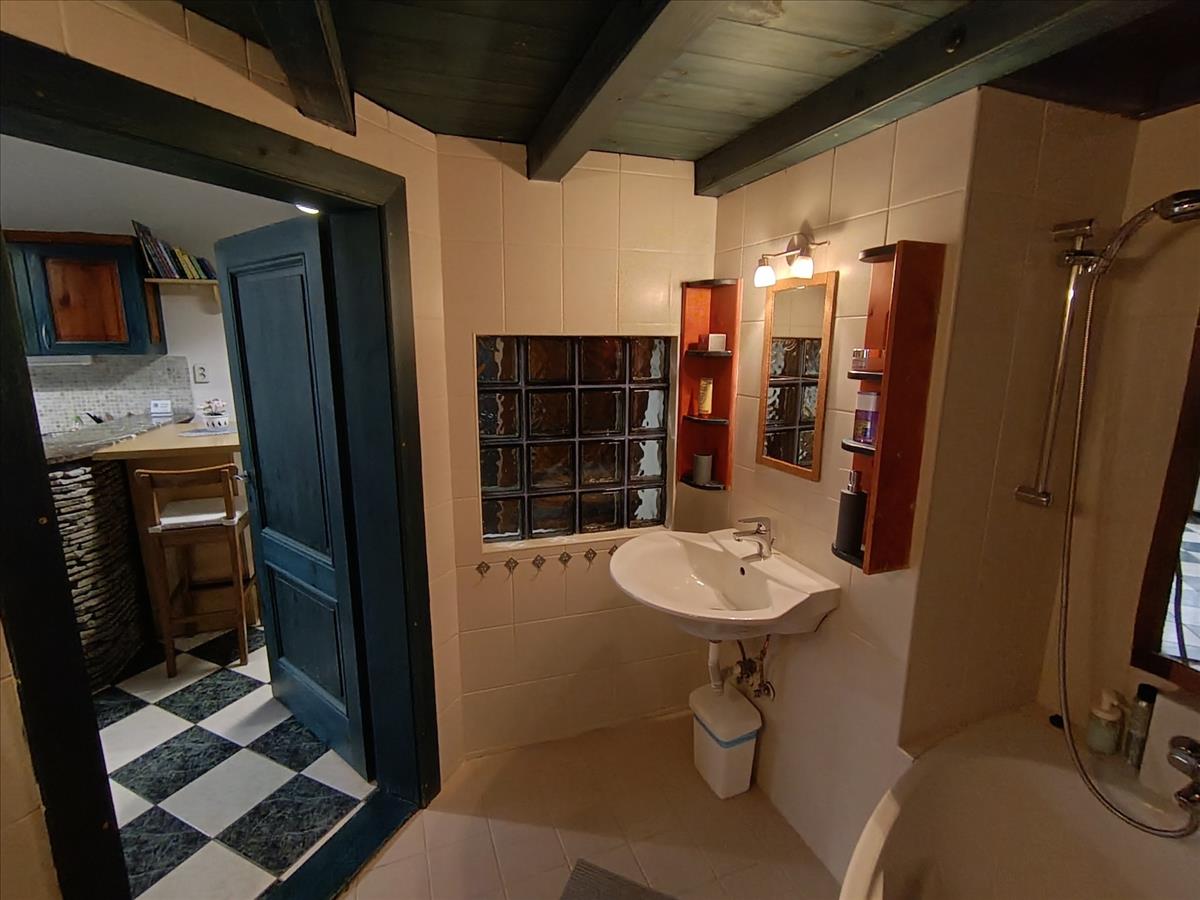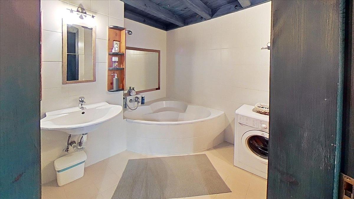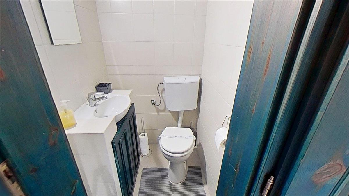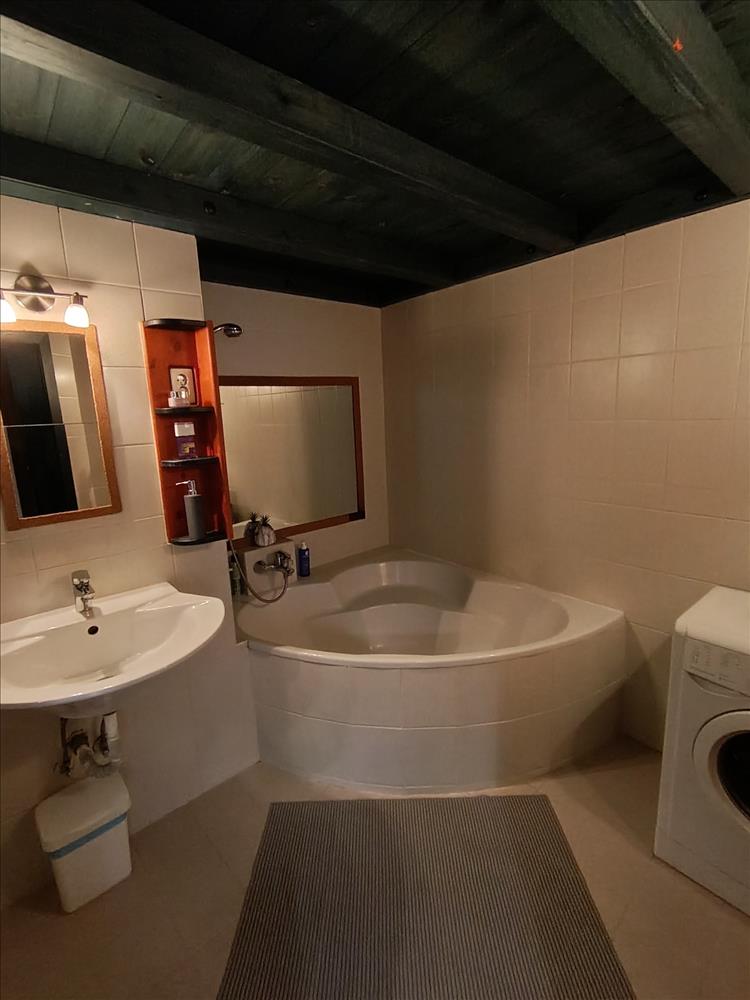 A fürdőszobában tágas sarokkádban fürödhetünk, a wc külön helyiségben kézmosóval is fel van