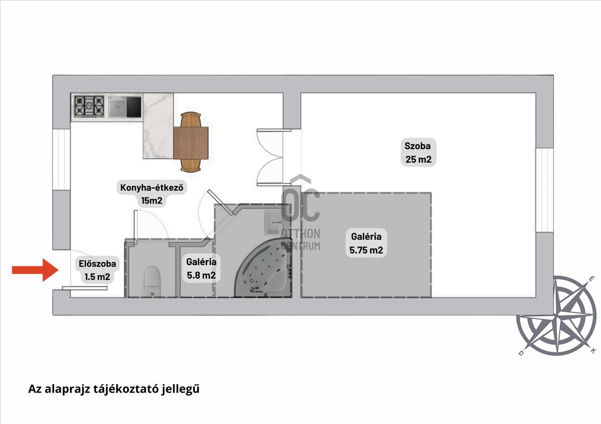 ➡️ Felosztása: előszoba, fekvő galériás lakószoba, konyha-étkező szintén galériával, fürdőszoba, WC.