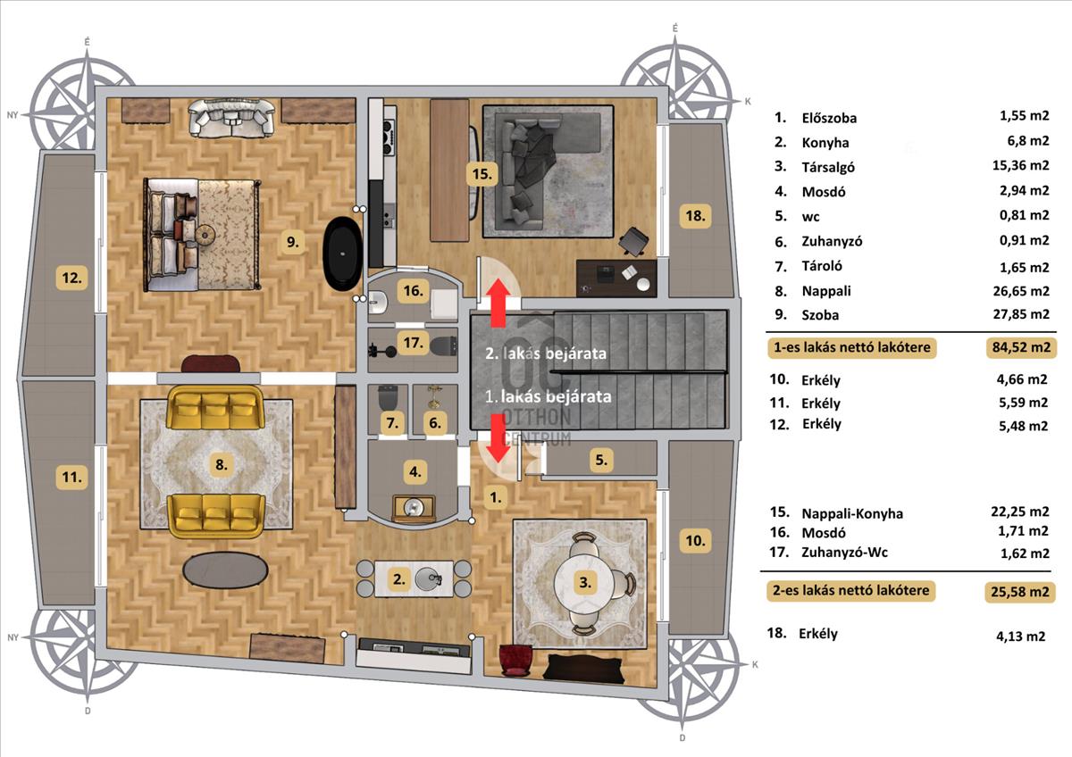 - Az elrendezés ideális lehet többgenerációs együttélésre, otthon és munka kombinálására, vendéglakás kialakítására, vagy befektetési célra is.