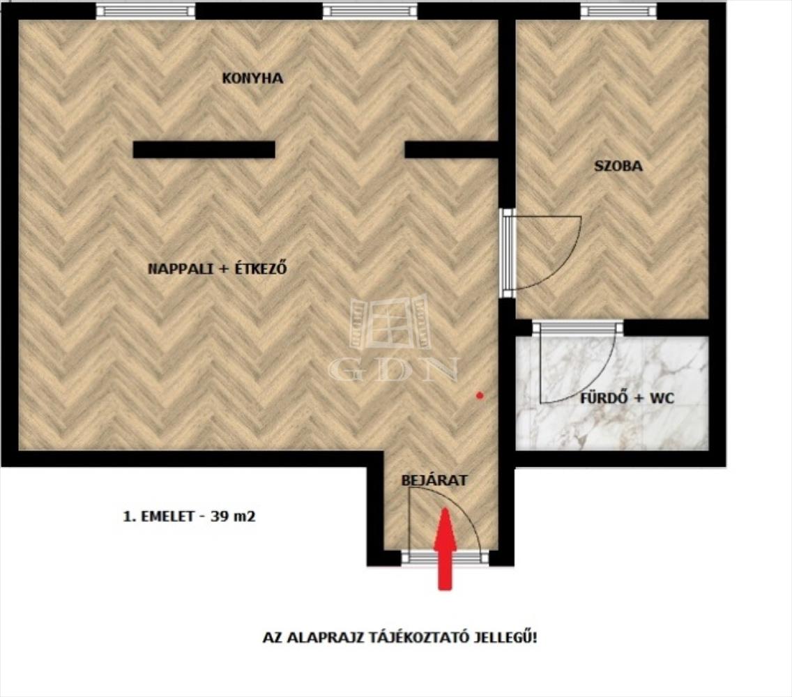 1. emelet: 39 m2 – 2 szoba – 1 fürdő