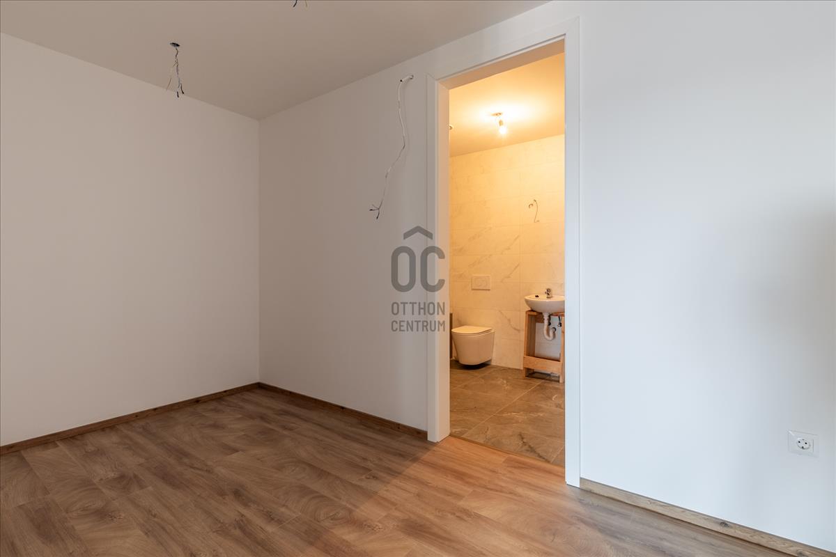 A felső szint már a teljes nyugalomé: egy különálló hálószoba saját gardróbbal és fürdőszobával, ahol a tér igazi különlegessége a teljes üvegfal. Ez a megoldás vizuálisan összeköti a szinteket, miközben egészen egyedi, modern hangulatot ad – ritka, látványos és nagyon „penthouse-érzés”.