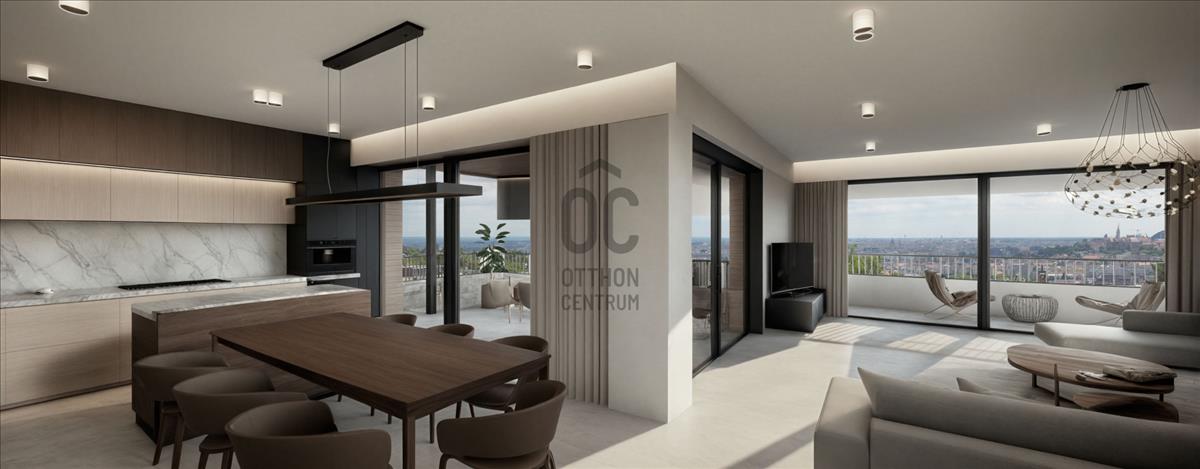 Budapest II. kerületének Rézmál részén eladó új építésű társasház első emeleti panorámás 141 m² -es nappali + 3 hálószobás két fürdőszobás négy erkélyes lakás opcionálisan megvásárolható garázsokkal, tárolóval.