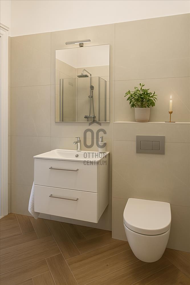 A lakásban zuhanyzós fürdőszoba WC-vel, valamint külön vendég wc kézmosóval is van, ami több fő esetén, illetve vendégforgalom mellett is kényelmes megoldás.