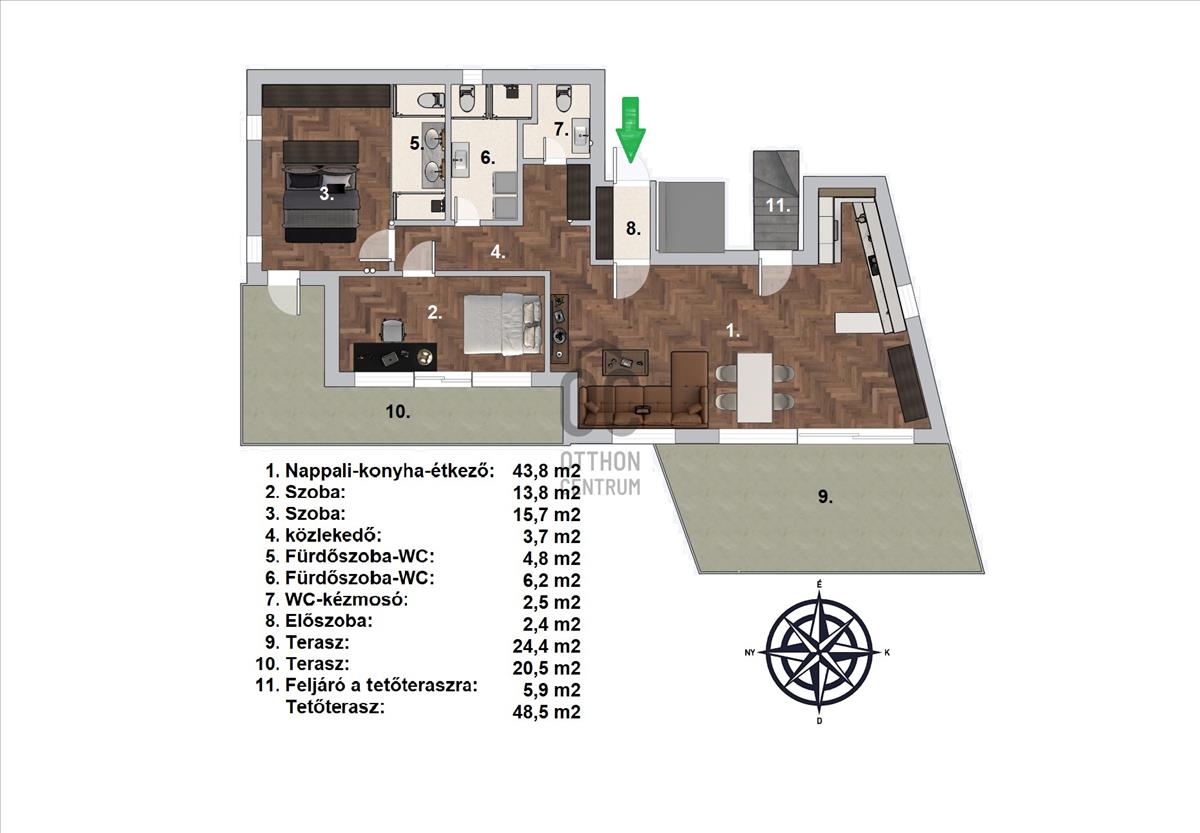 - 2. emeleti, 96 m2-es, 44, 9 m2 terasszal és 48, 5 m2 panorámás tetőterasszal rendelkező, luxus minőségű penthouse lakás.