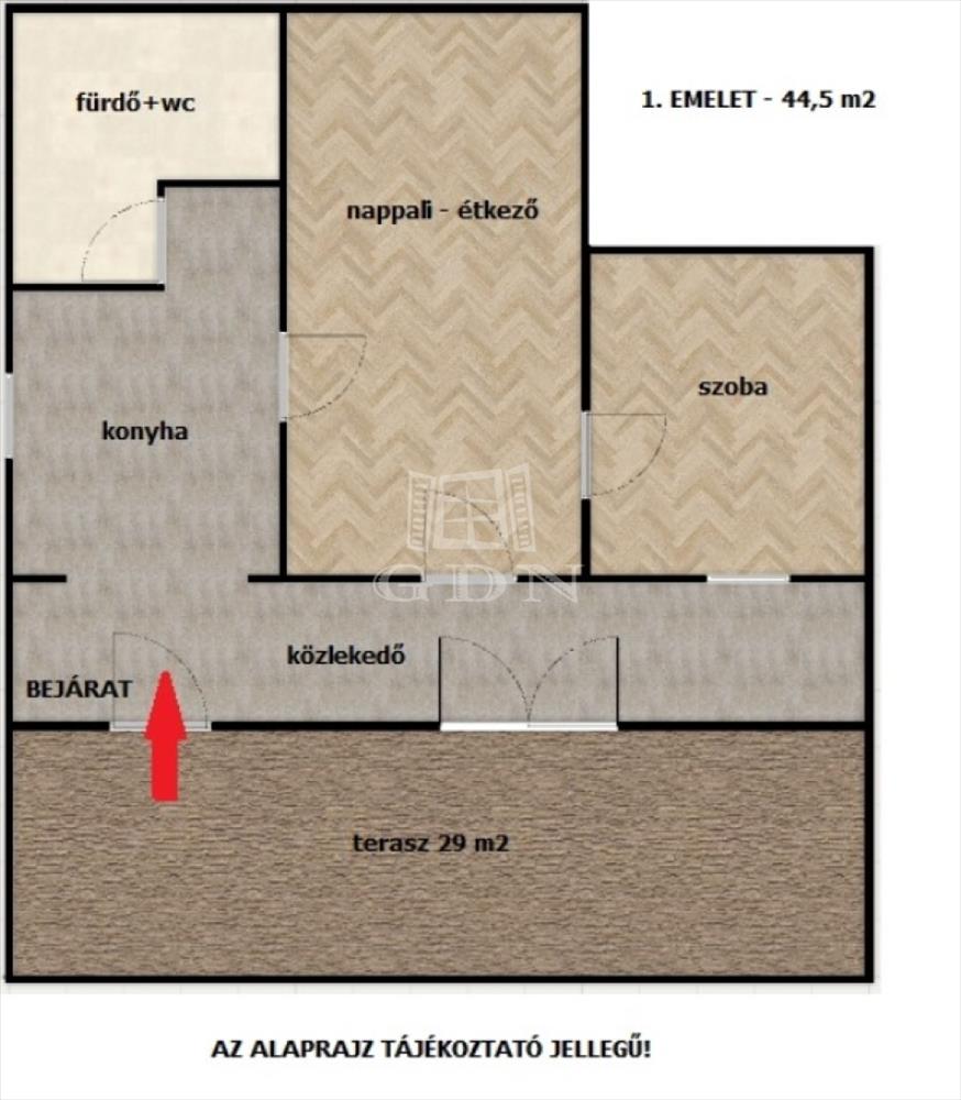1. emelet: 44, 5 m2 – 2 szoba – 1 fürdő – terasz: 29, 3 m2