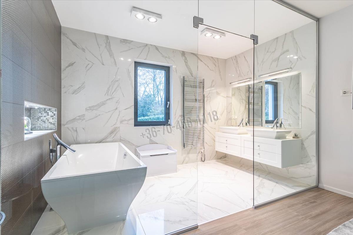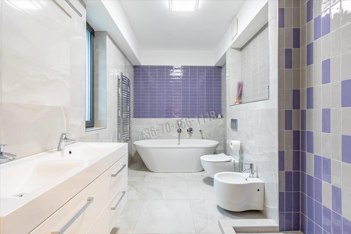 Itt kapott helyet egy nagyméretű hálószoba saját fürdőszobával, dupla mosdóval és szabadon álló káddal.