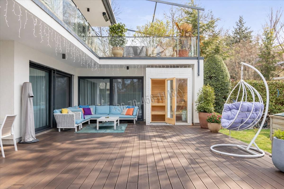A földszinti, részben fedett terasz valódi szabadtéri nappali: 12 személyes étkezőasztal, kültéri lounge, finn szauna, napozóágyak, függőfotel és gyermekjátszótér teszi teljessé az élményt.
