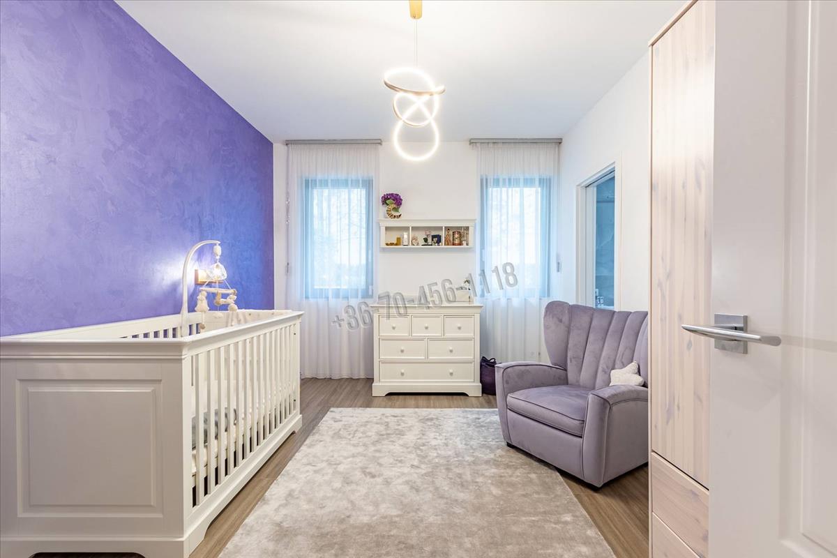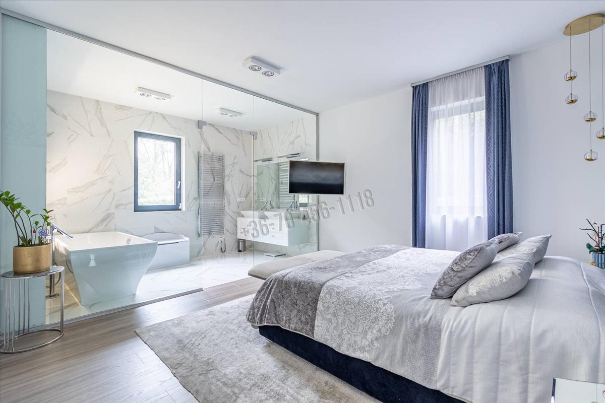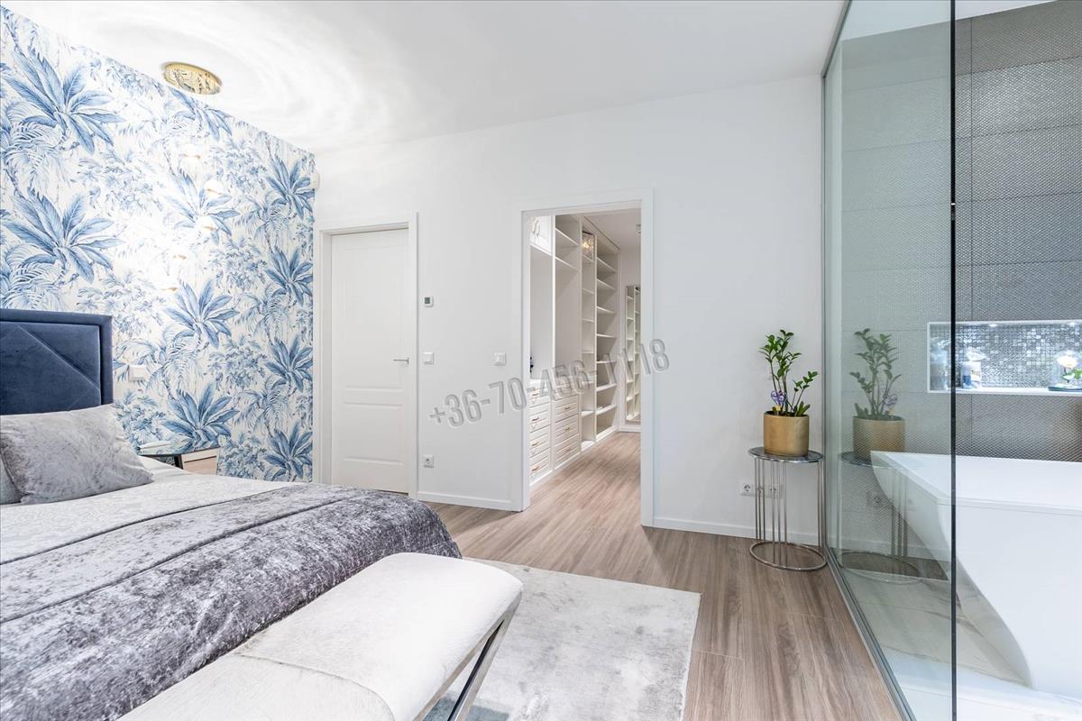 A közlekedőből nyílik további egy hálószoba, és egy kádas fürdőszoba, valamint a szülői apartman - ami egy egyedi megjelenésű -, üvegfallal leválasztott látványfürdővel, design térkáddal, dupla mosdóval, illetve járható gardróbbal is rendelkezik.