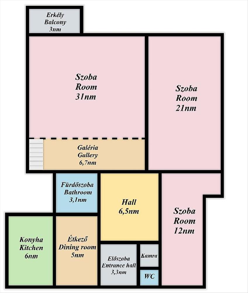 A lakás elrendezése praktikus: a 31 m²-es, galériás nappalihoz erkély kapcsolódik, a tágas hálószobák és a konyha–étkező rész jól elkülönülnek. a keleti fekvésnek és a nagy belmagasságnak köszönhetően a terek világosak és szellősek.
