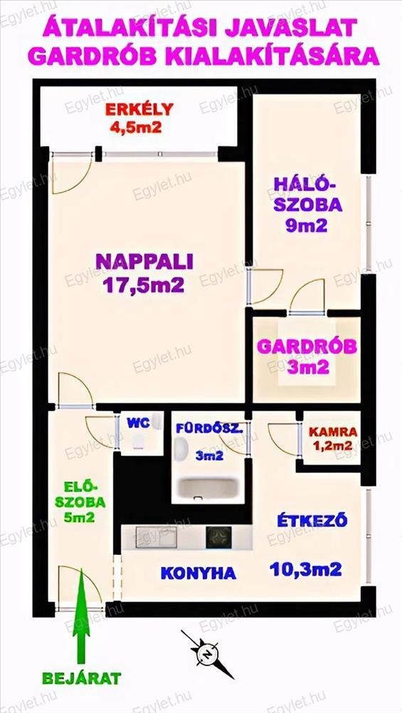 Igény szerint, a hálószoba egy részének leválasztásával, kis ráfordítással, könnyen kialakítható egy 3m2 gardrób helyiség, amely rengeteg holmi tárolására teremt lehetőséget.