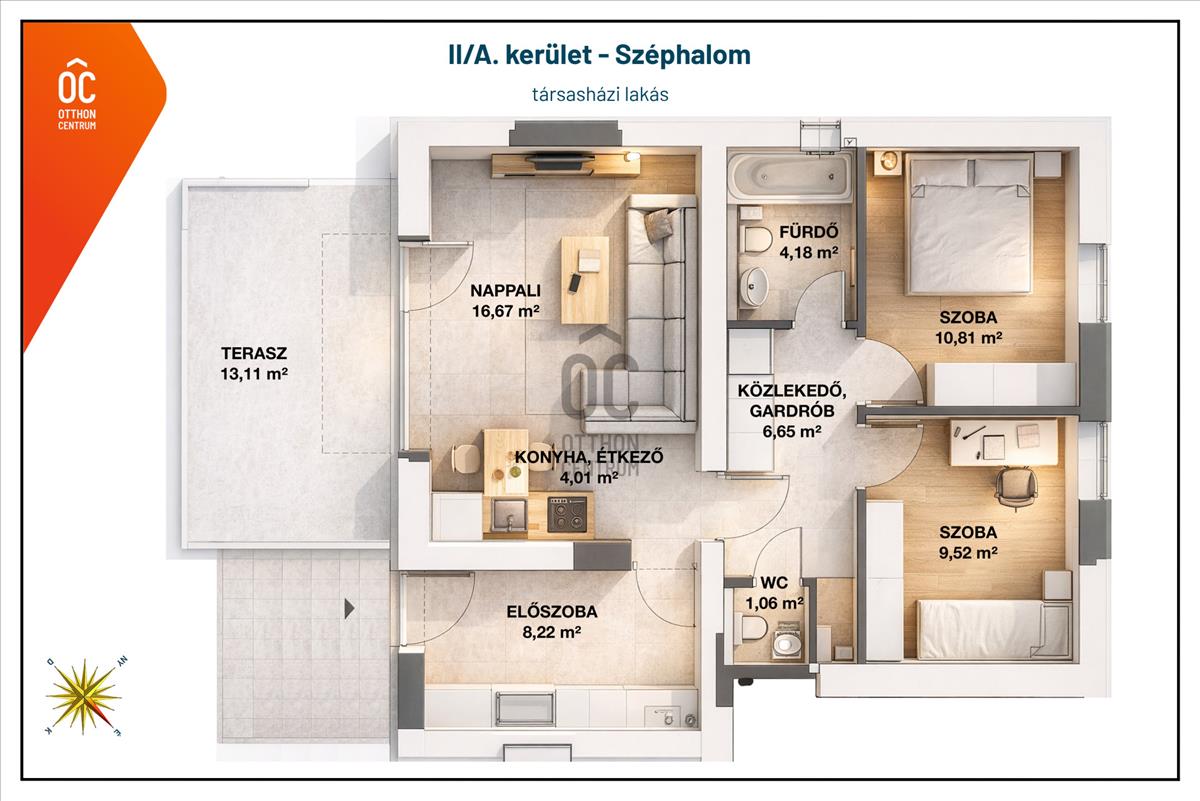 Elosztás: Amerikai konyhás nappali + 2 különnyíló hálószoba, fürdőszoba +wc, gardrób, kézmosós wc