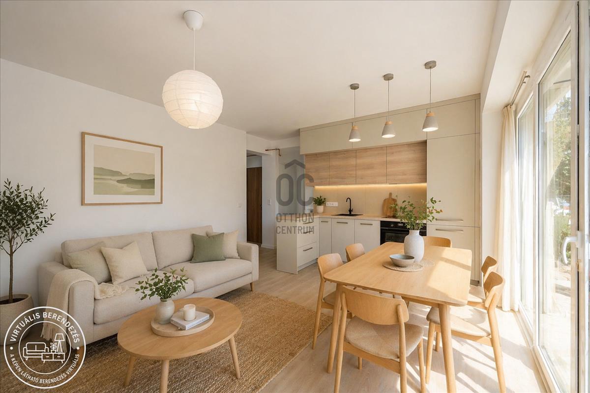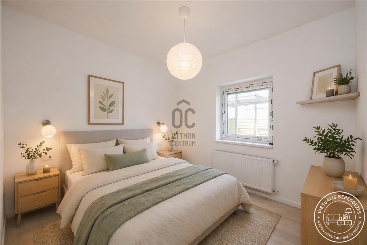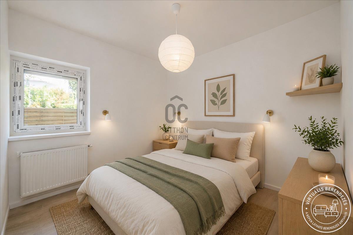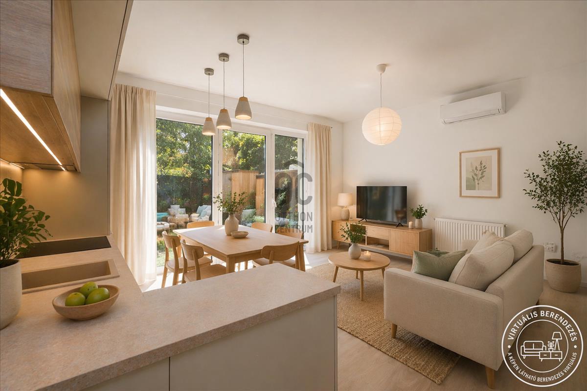 Modern élettér: praktikus beosztású, amerikai konyhás nappali a családi élet központja, míg a két külön hálószoba privát szférát biztosít a pihenéshez vagy munkához.