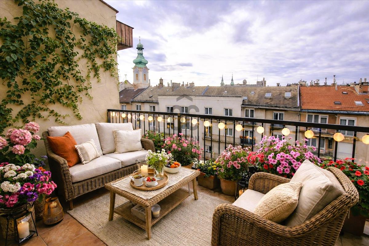 A 4, 4 négyzetméteres erkélyről látható a Duna és a Parlament is, ami tökéletes helyszínt biztosít a hangulatos reggeli kávéhoz vagy az esti beszélgetésekhez.