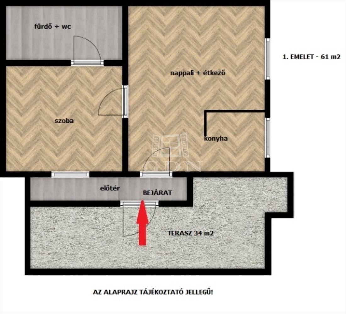 1. emelet: 61 m2 – 2 szoba – 1 fürdő – terasz: 34 m2