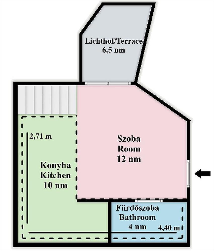 Az ingatlanhoz tartozik egy kis lichthof rész, amely lehetőséget ad egy asztal és székek elhelyezésére, így egy meghitt, csendes kültéri pihenősarok is kialakítható.