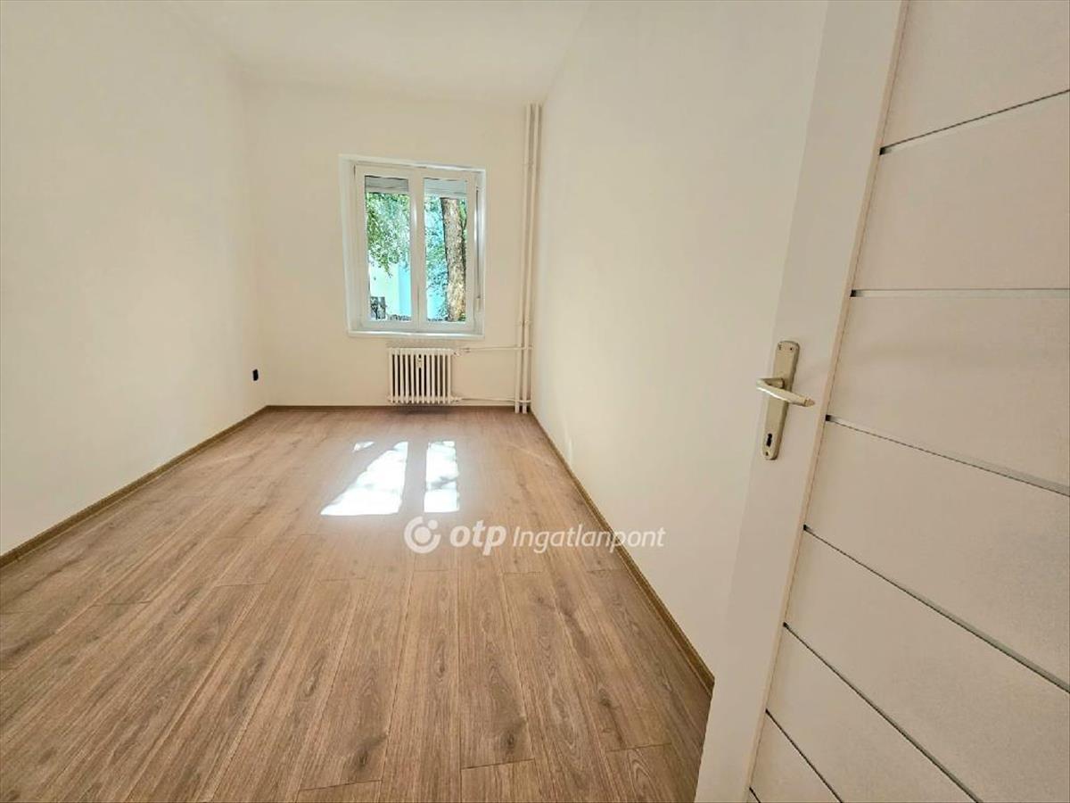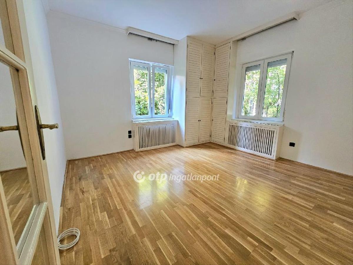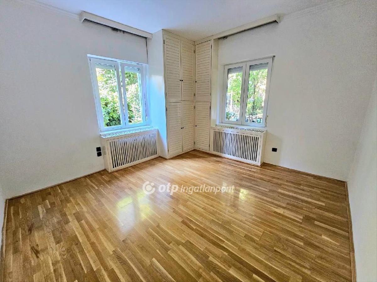A 16 négyzetméteres hálószobában is van két nagy ablak, egy beépített sarokszekrény és ebben a helységben is jó minőségű faparketta található.