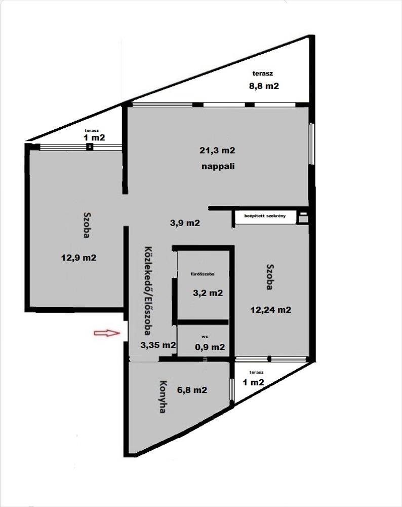 A lakás jó alaprajzi adottságokkal rendelkezik, a válaszfalak módosításával akár amerikai konyhás nappali is kialakítható valamint megváltoztatható/cserélhető a helységek funkciója