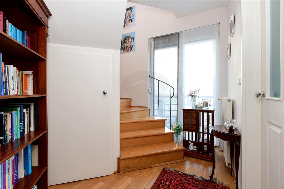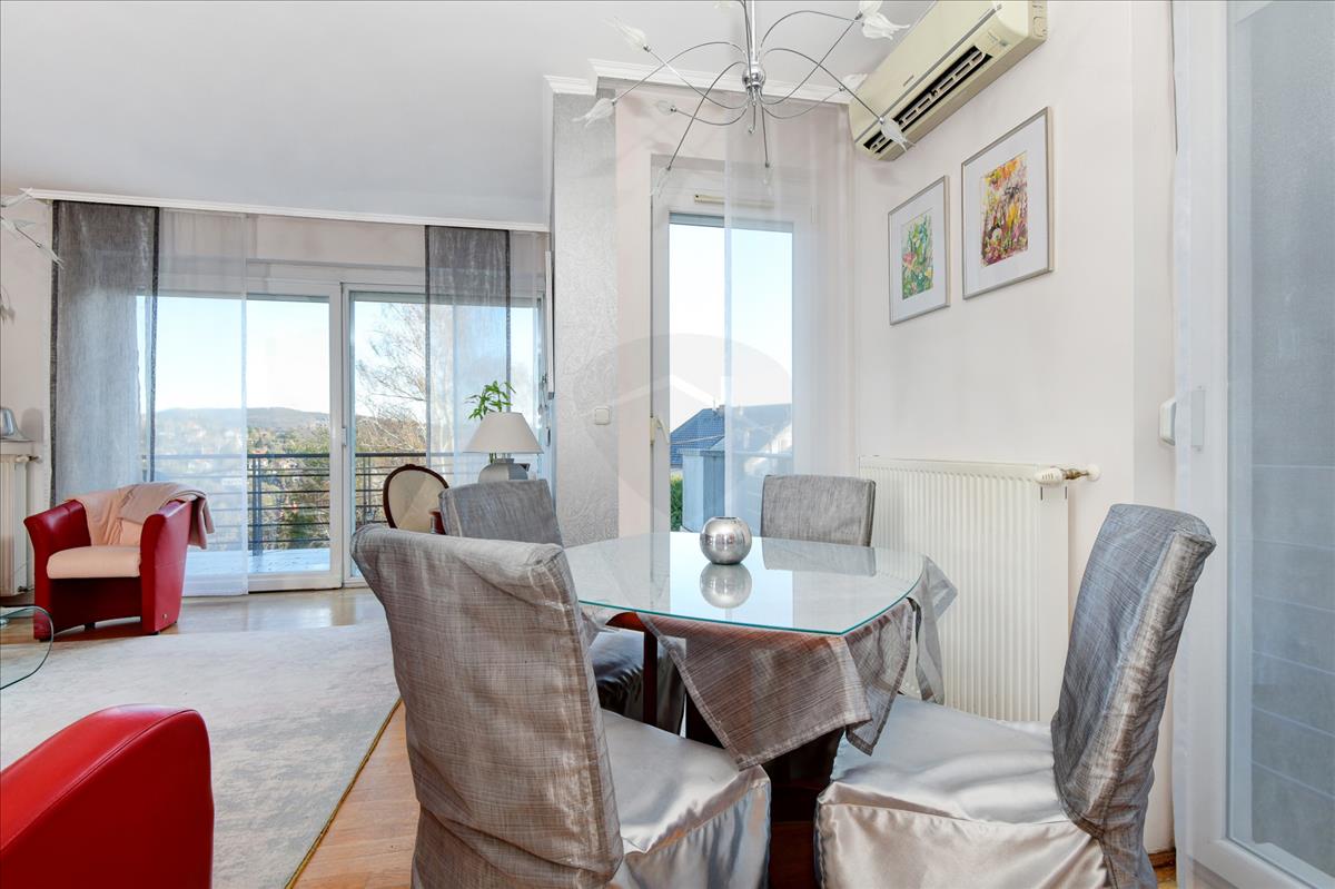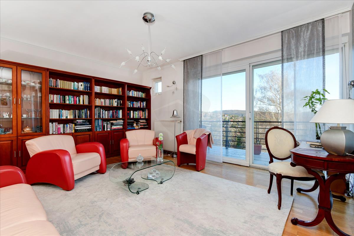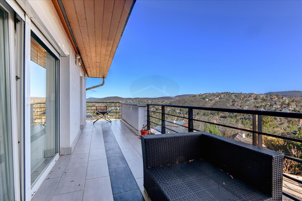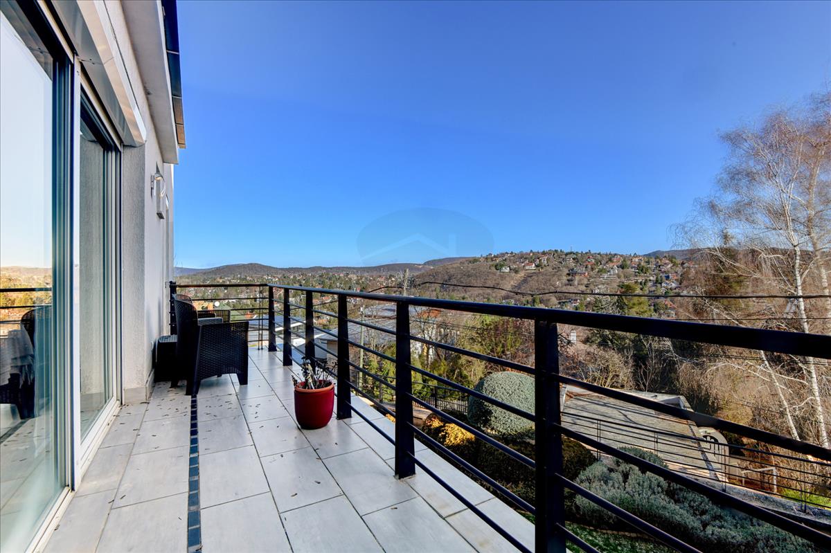 ELADÓ a II. kerületben, (1029) Máriaremetén, egy 3 + 1 fél szobás, belső kétszintes, 110 nm -es (bruttó 125 nm a teraszokkal), újszerű, klímás, panorámás, 1. emeleti lakás.