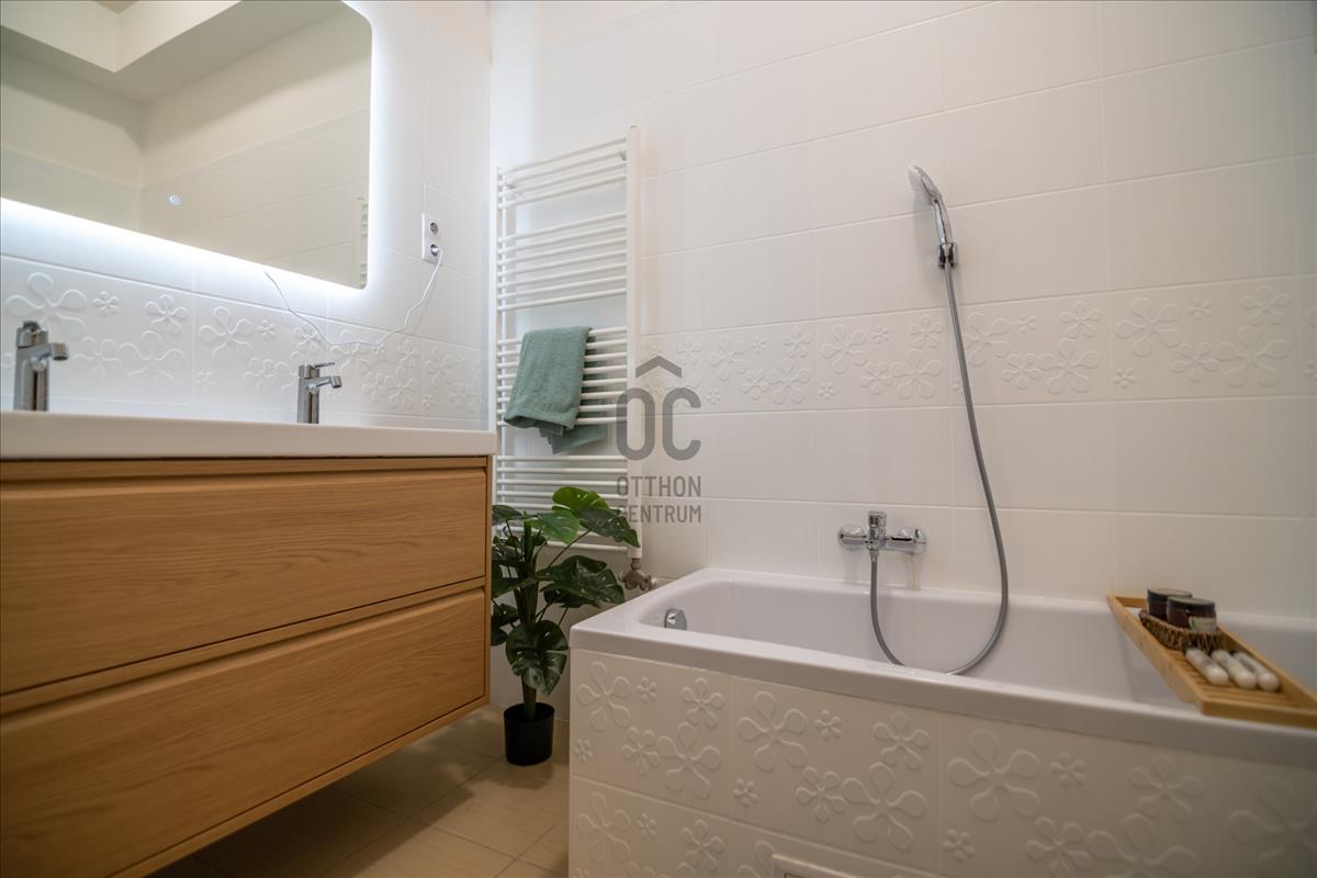 Teljes körűen bútorozott és gépesített, modern, igényesen kialakított fürdőszoba, városi panoráma.