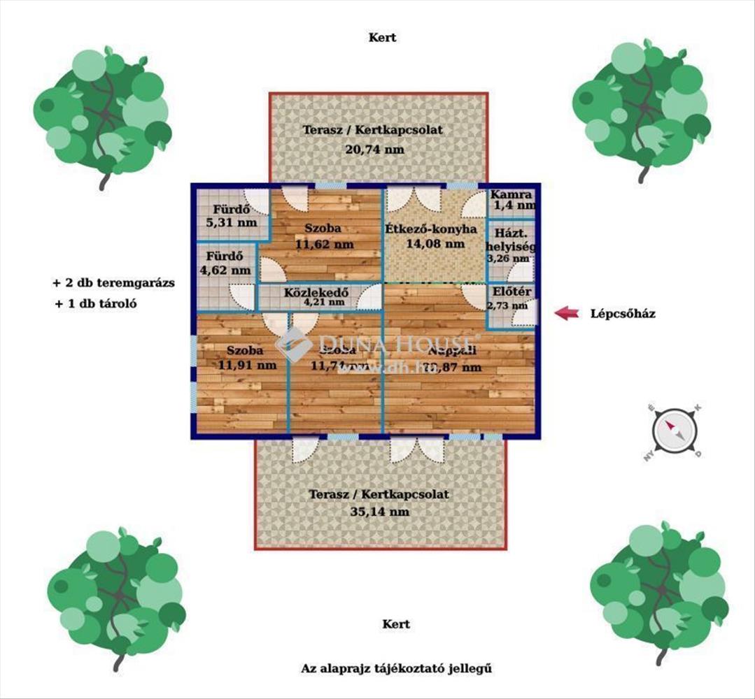 A lakás nettó alapterülete 92, 35 m2 + 56 m2 terasz + kertkapcsolat.