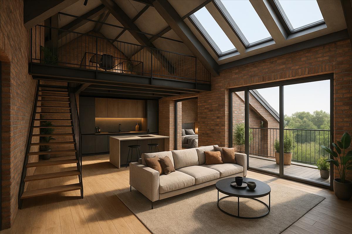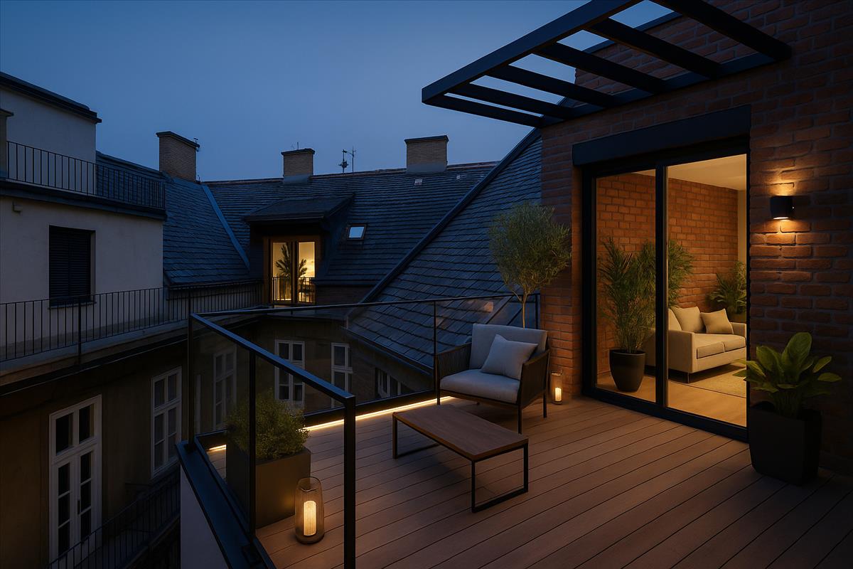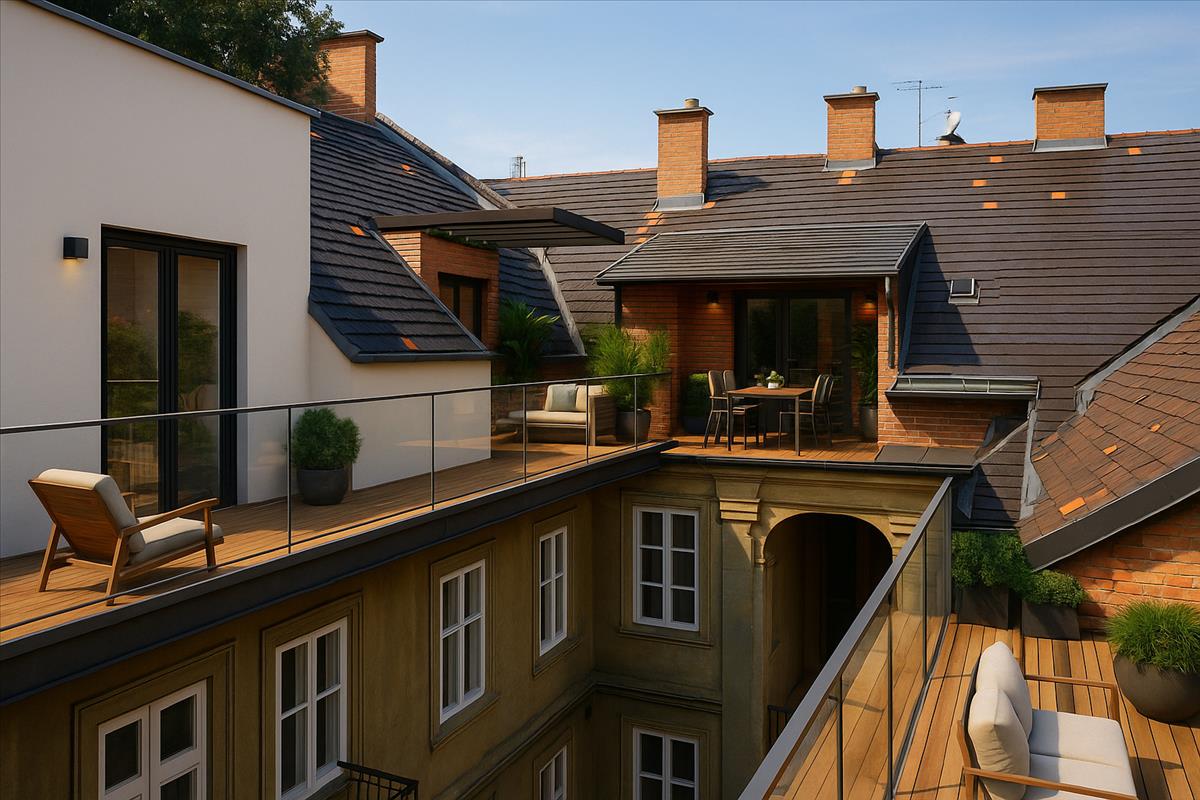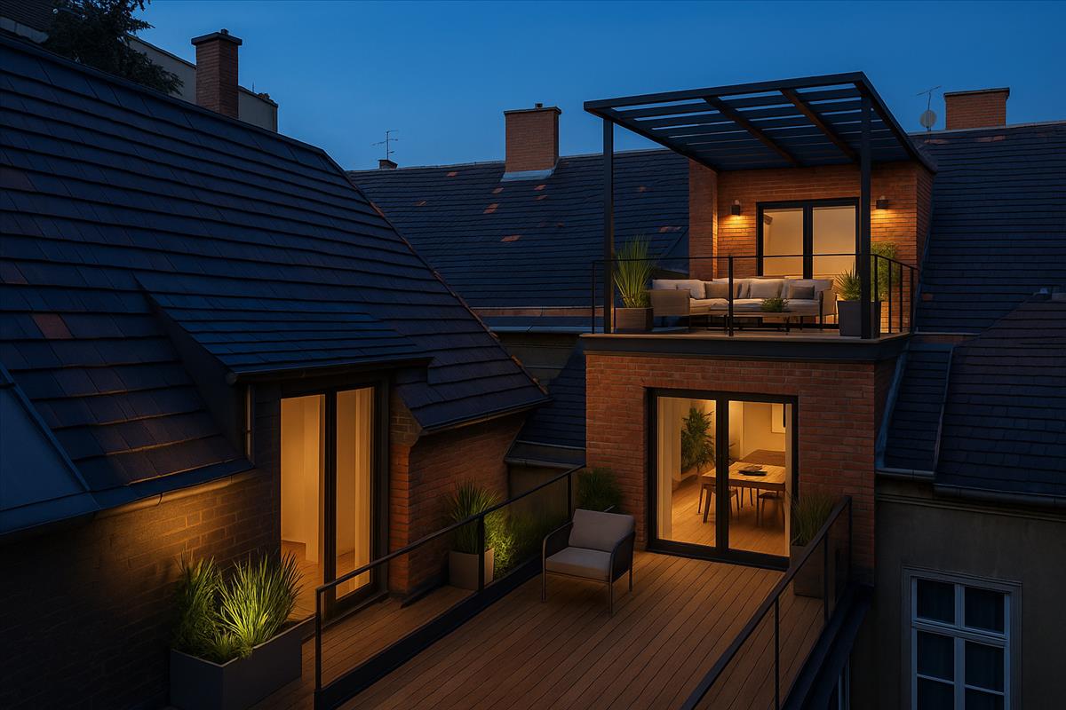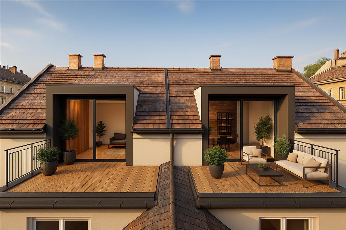 A tetőszerkezet adottságai alapján egy külső és két belső tetőterasz is kialakítható, amelyek exkluzív, napfényes kültéri életteret biztosítanak.