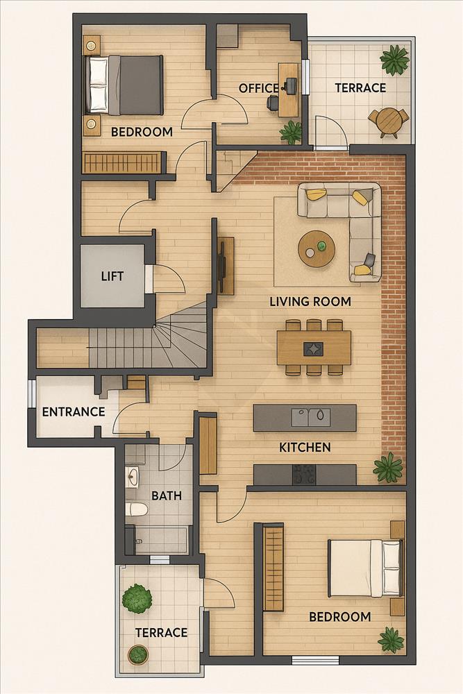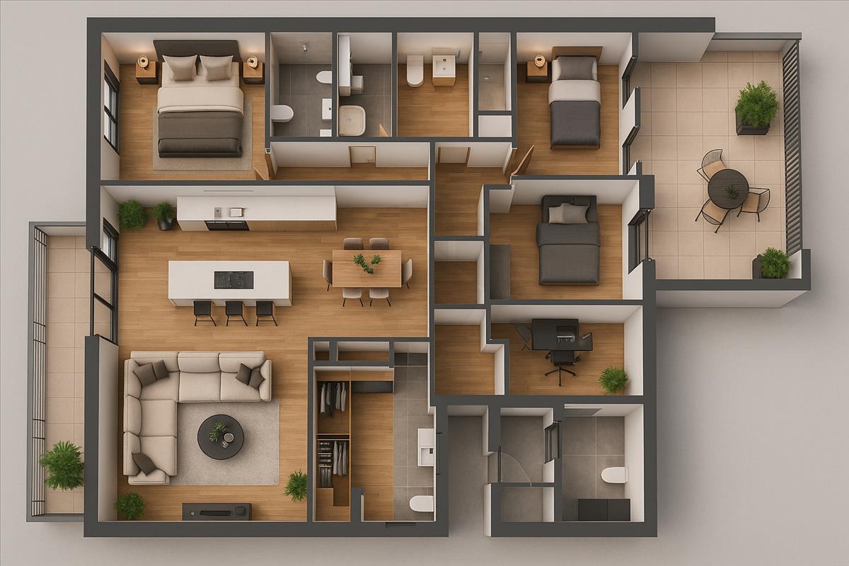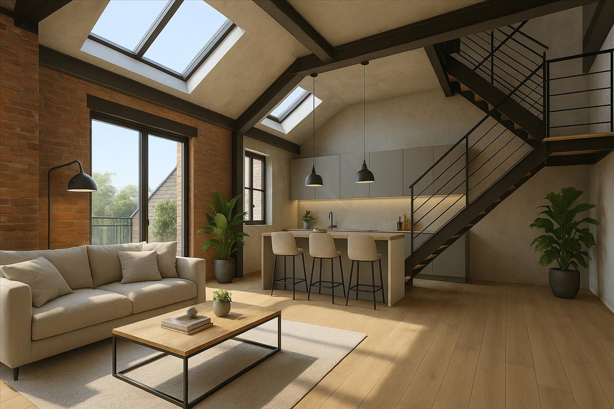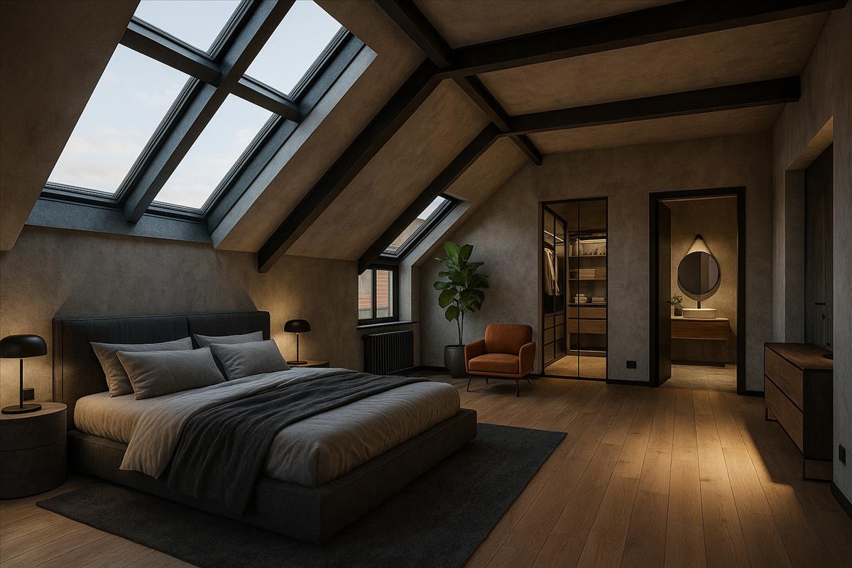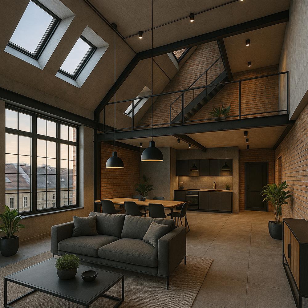 A tetőszerkezet adottságai alapján egy külső és két belső tetőterasz is kialakítható, amelyek exkluzív, napfényes kültéri életteret biztosítanak.