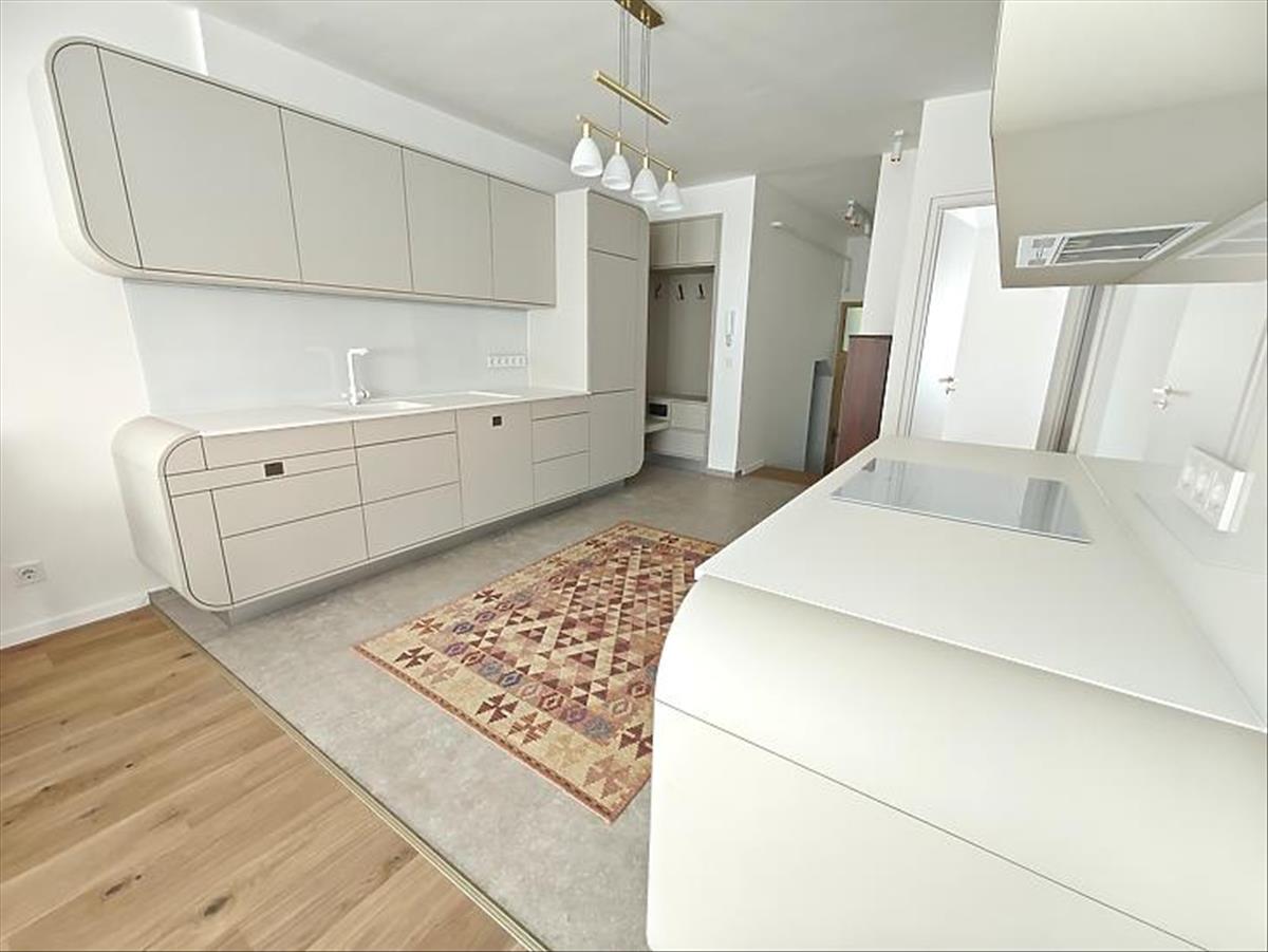 A felső szinten egy amerikai konyhás nappali, hatalmas faltól-falig érő ablakokkal, egy hálószoba és egy fürdőszoba került kialakításra. a nappaliból nyílik a 6nm-es erkély, mely üvegkorlátot kapott. Minden bútor, beleértve a gépesített konyhabútort is, egyedi tervek alapján készültek, kifejezetten ide.