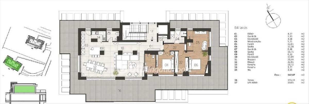 A lakás 142, 87 nm+155, 34 nm óriás terasz.