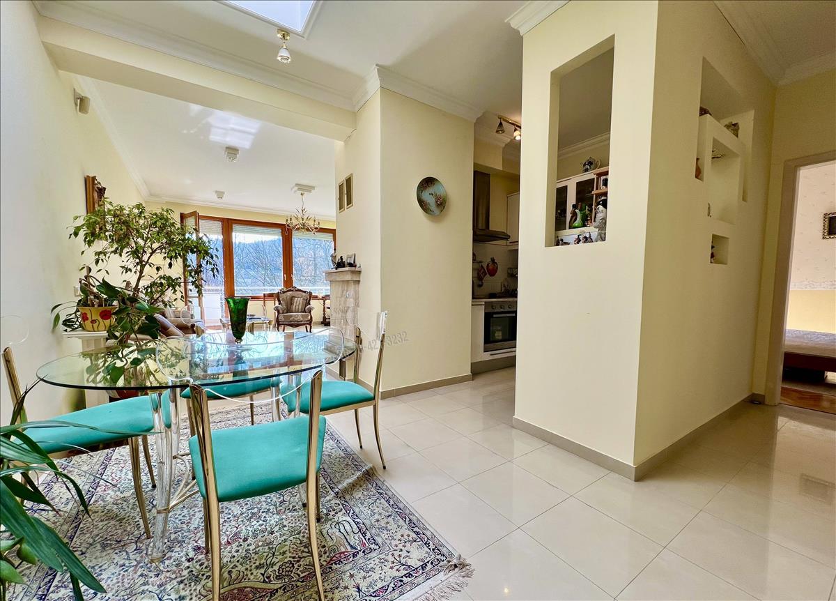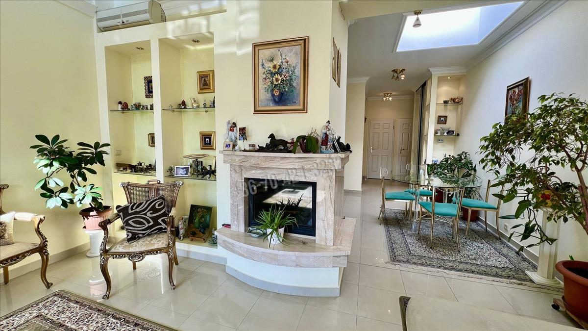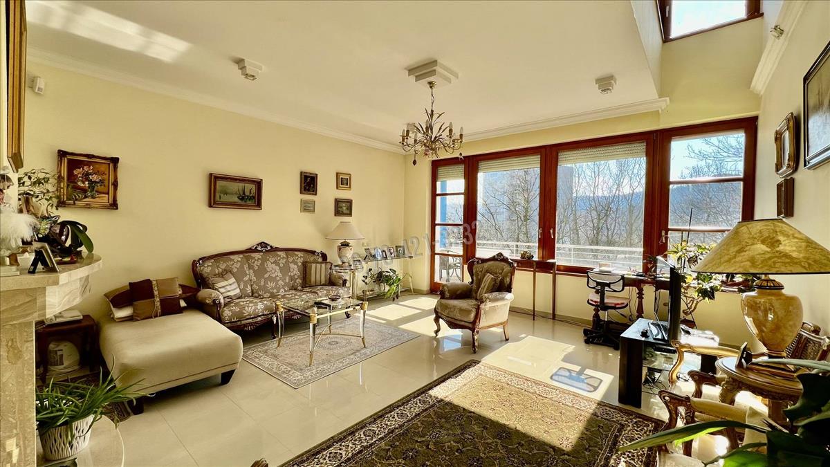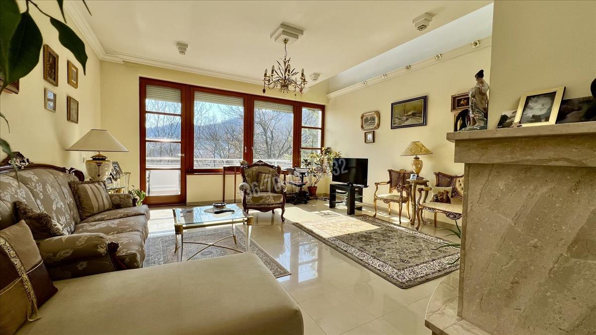 A nappali nagy üvegfelületei és a két bevilágító tetőablak különösen világossá teszik a lakást. a nappaliban fatüzelésű kandalló működik.