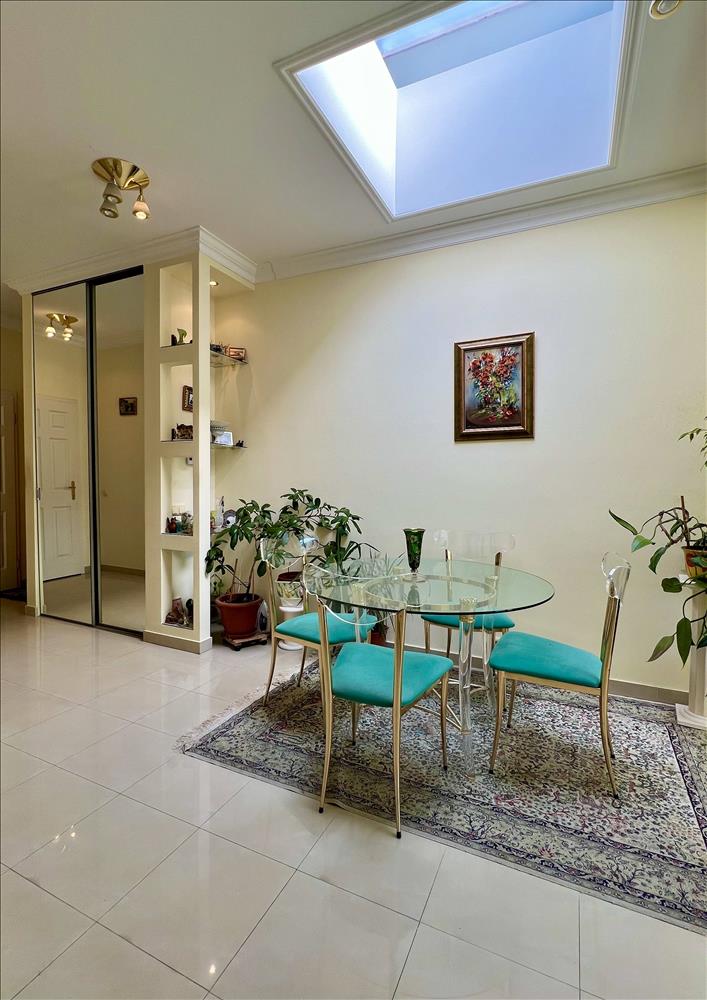 Large glass surfaces in the living room and two skylights make the apartment especially bright. There is a wood-burning fireplace in the living room.