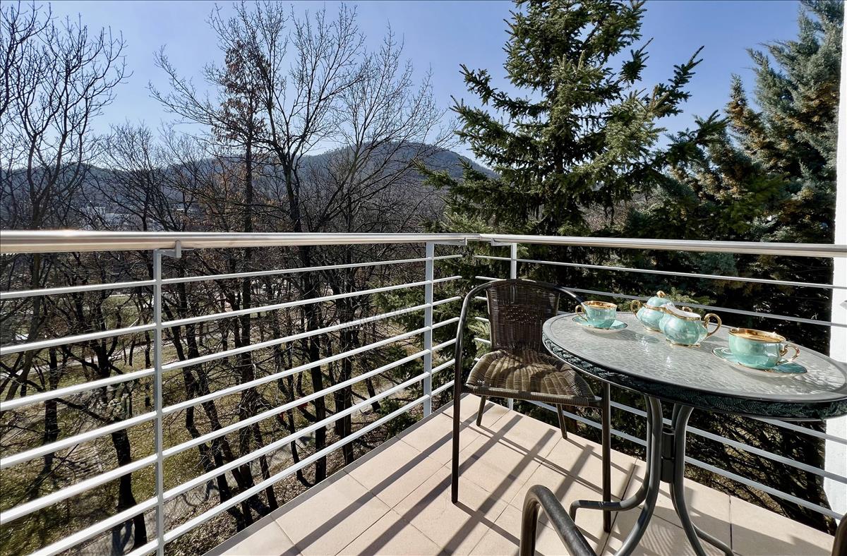 From the terrace, you can enjoy a landscaped view of the complex’s private garden and pond, as well as the iconic Erzsébet Lookout at Normafa.