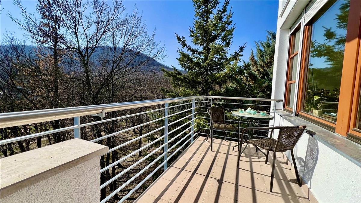 A teraszról parkos kilátás nyílik a lakópark saját kertjére és tavára, valamint a Normafa ikonikus Erzsébet-kilátója is látható.