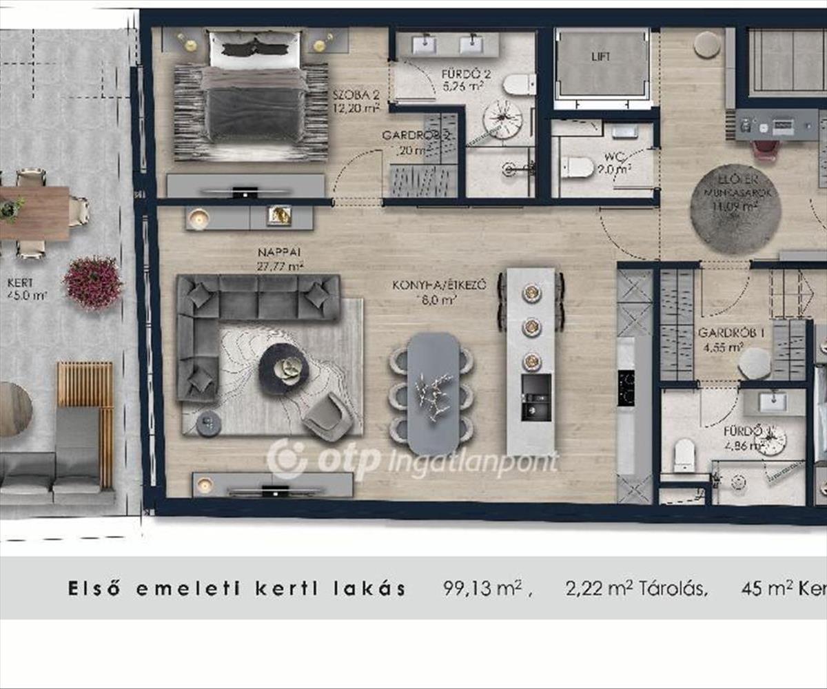 A lakás lakóterülete összesen 99, 44 nm + hozzátartozó privát kert 45 nm és egy magán tároló tartozik az ingatlanhoz, így összesen 146, 35 nm.
