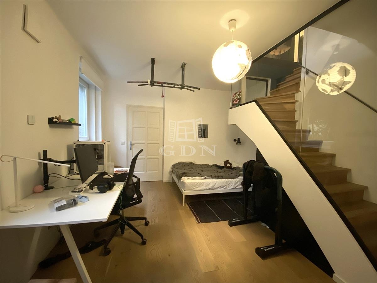 A lakás belső kétszintes. a lakás bejárata a felső szintre nyílik, itt egy hatalmas, egy légtérben elhelyezkedő nappali, étkező, konyha található, valamint egy hálószoba és egy fürdőszoba.