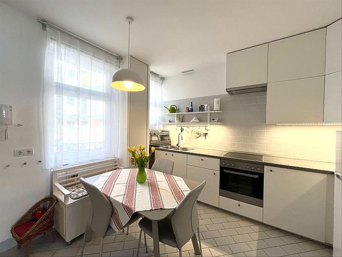 A konyha új bútorzatot kapott, étkezővel rendelkezik. a mosógép ki-és beállása ebben a helyiségben került kialakításra.