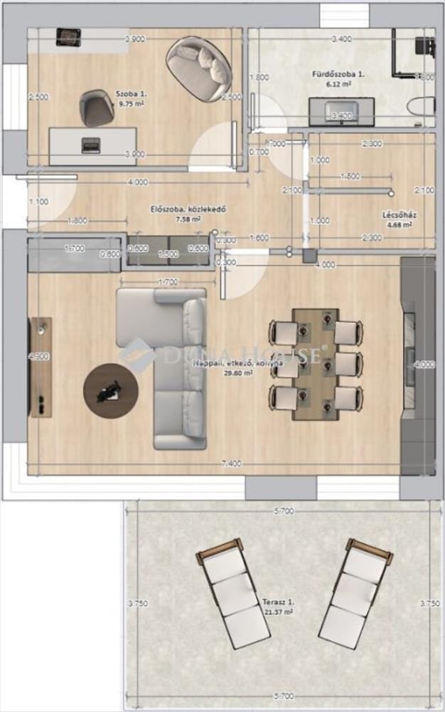 Tulajdoni lapon társasházi lakás. a lakóegységek 112 m2-es lakótérrel és hozzá tartozó 21 m2-es terasszal és 12 nm erkéllyel rendelkeznek.
