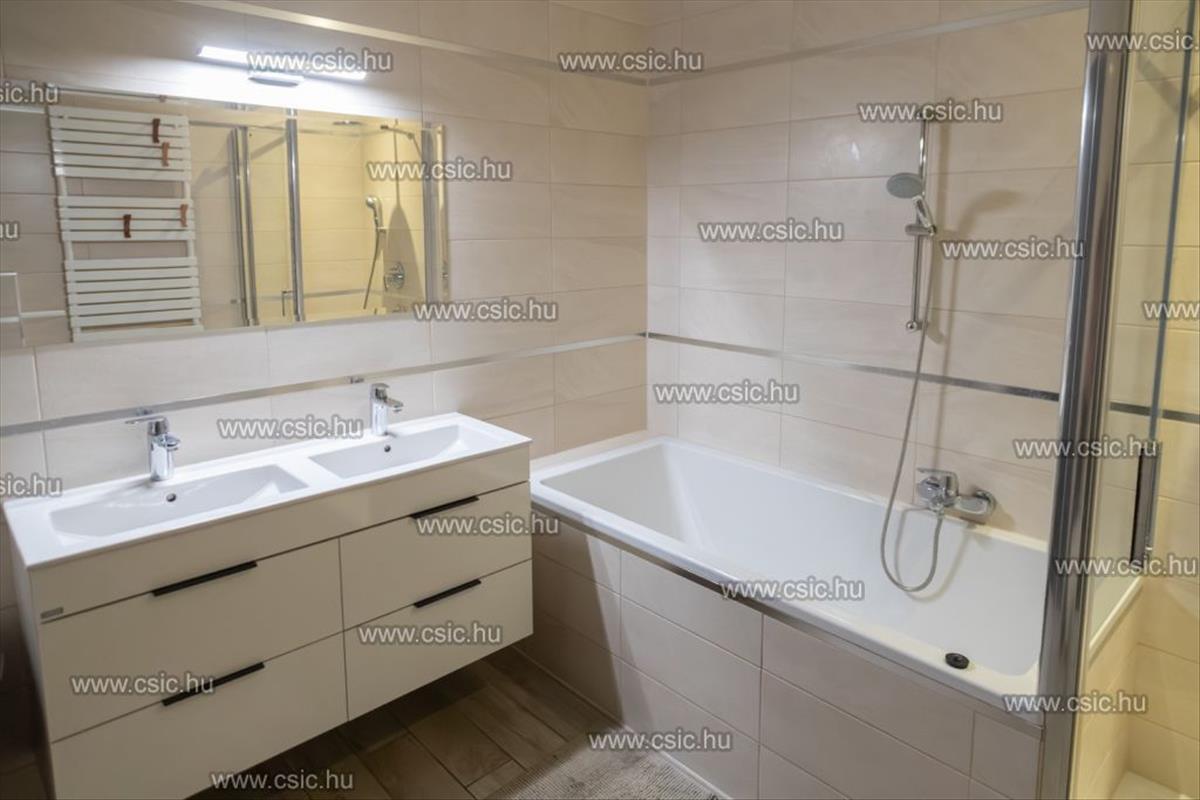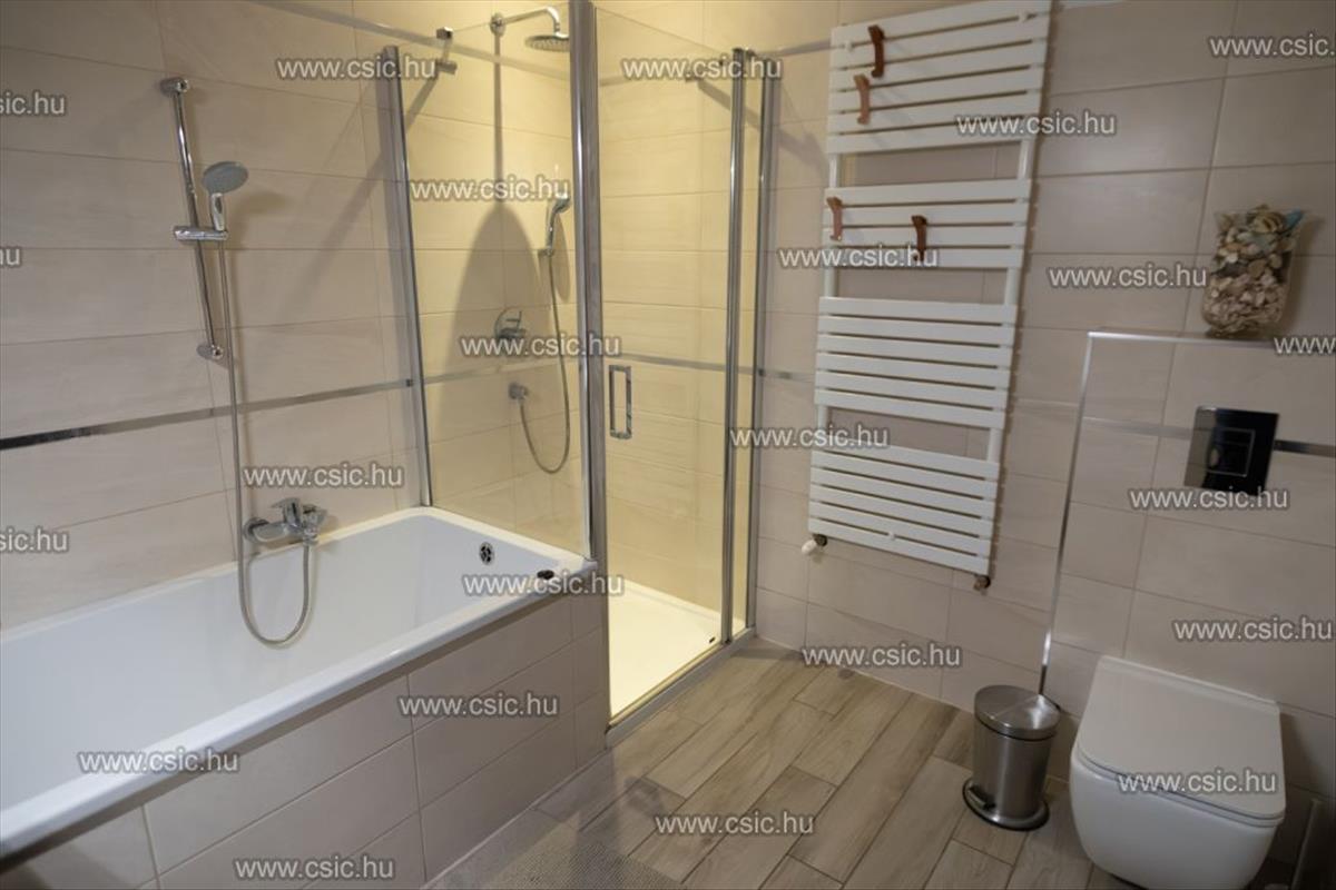 A duplakomfortos kialakításnak köszönhetően a fürdőszobában kád és tusolókabin is helyet kapott, emellett külön wc is rendelkezésre áll, valamint egy második wc a fürdőben.
