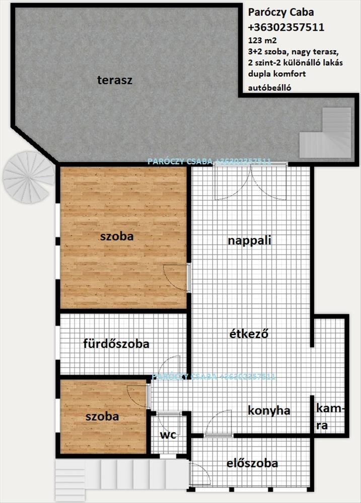 123 m2 (terek beépítésével 150 m2), 4+1 szoba, 2 fürdő, 3 wc, 50 m2 terasz.