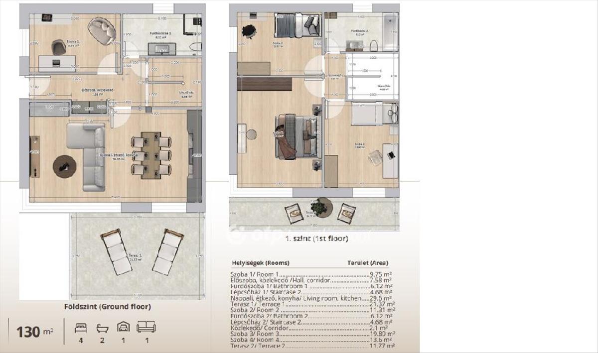 Az ingatlanok lakóegységenként 111 m2-es lakótérrel és hozzá tartozó 21 m2-es terasszal és 12 nm erkéllyel rendelkeznek.