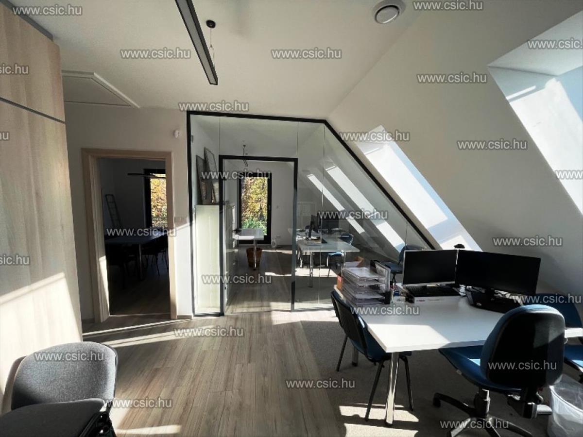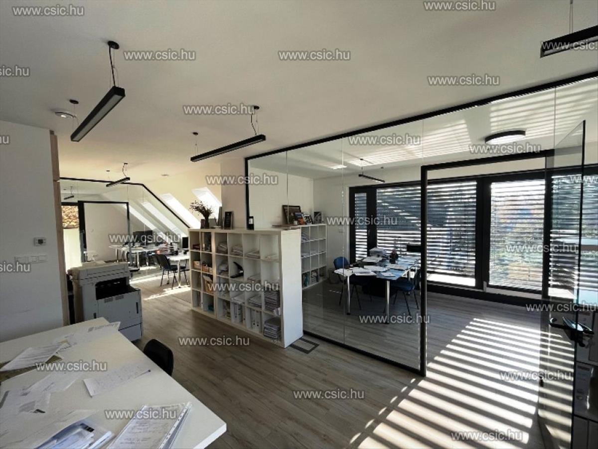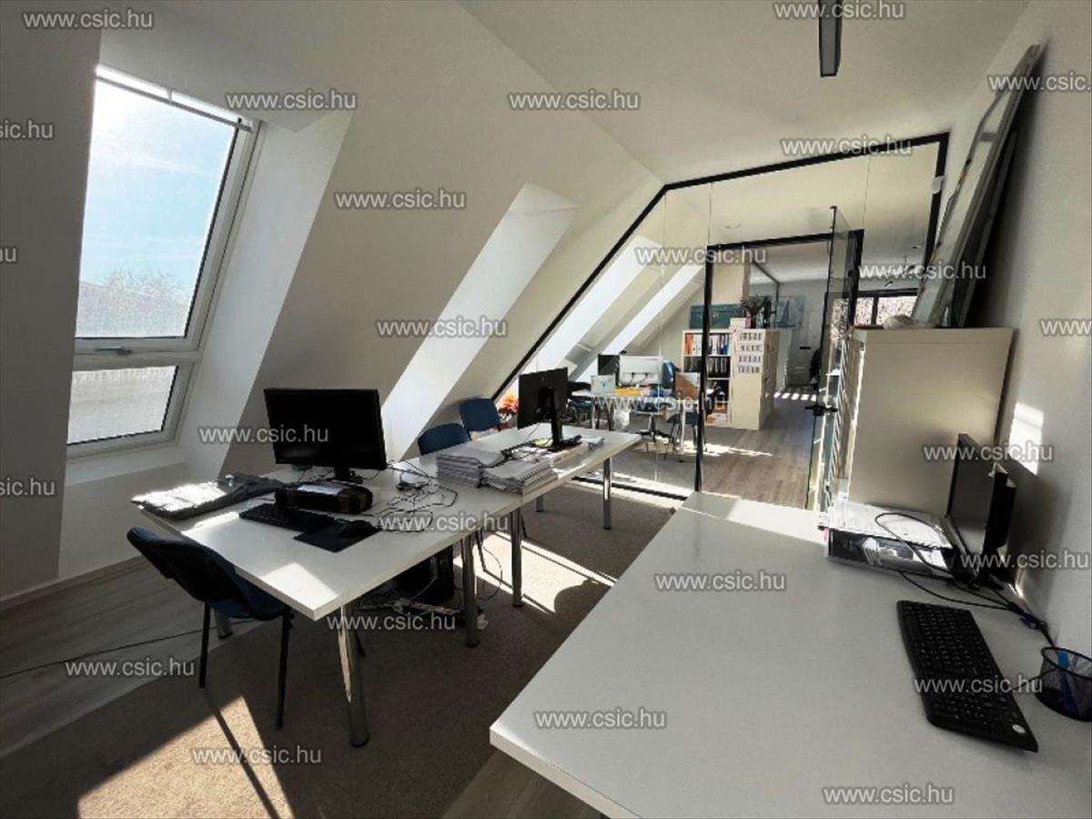 Az irodában ki van alakítva egy tárgyaló, egy üvegfallal leválasztott vezetői szoba és iroda helyiség, helyet kapott egy adminisztrációs, és egy egyterű iroda rész, amihez csatlakozik teakonyha étkezővel. Az irodából a nagy tetőteraszra több helyen is ki tudunk lépni. Az előszobához kapcsolódik egy női wc és egy fürdő helyiség. Az irodát körbe süti a nap, déli, keleti és nyugati tájolású.