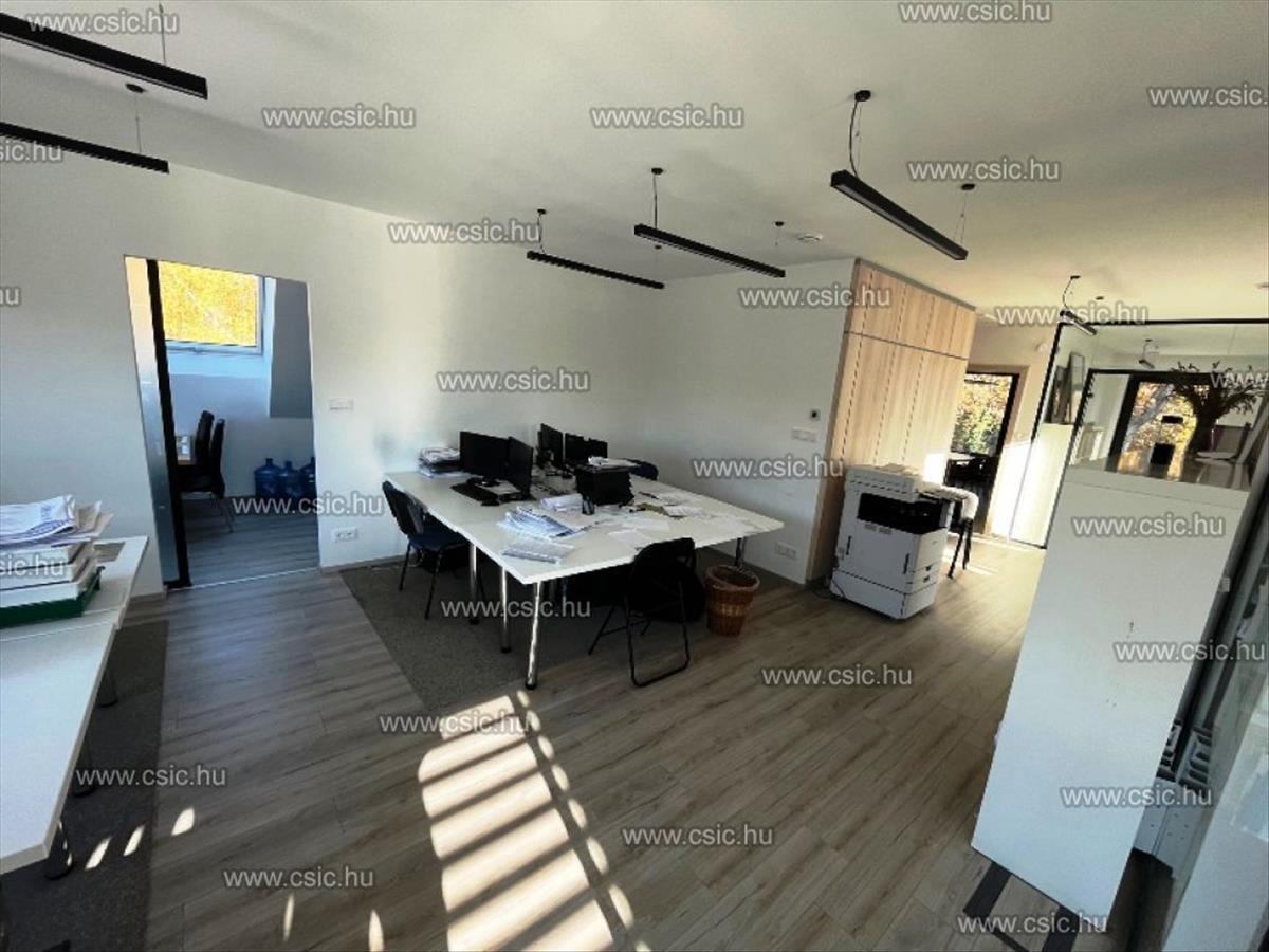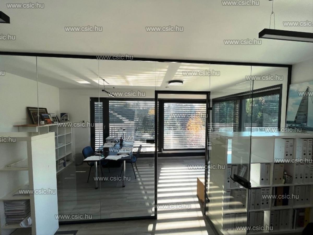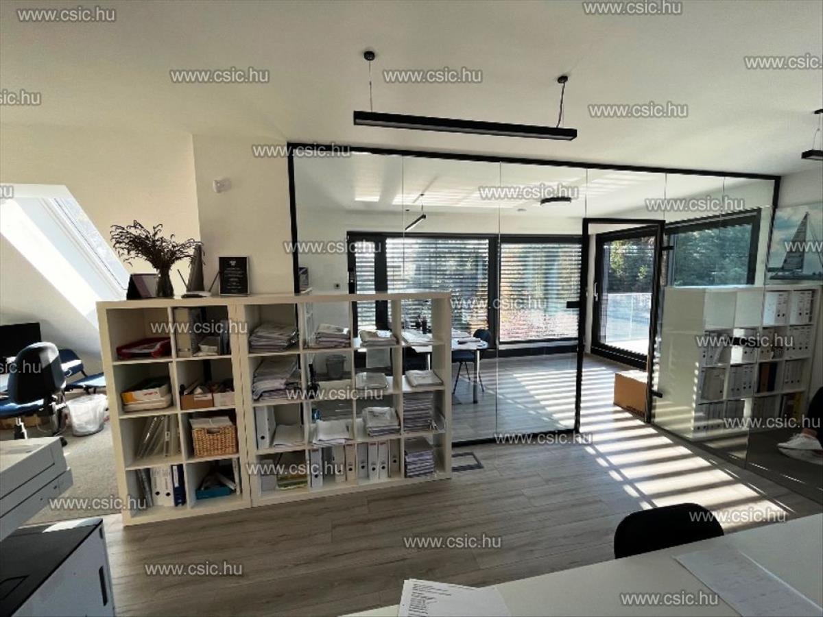 Az irodában ki van alakítva egy tárgyaló, egy üvegfallal leválasztott vezetői szoba és iroda helyiség, helyet kapott egy adminisztrációs, és egy egyterű iroda rész, amihez csatlakozik teakonyha étkezővel. Az irodából a nagy tetőteraszra több helyen is ki tudunk lépni. Az előszobához kapcsolódik egy női wc és egy fürdő helyiség. Az irodát körbe süti a nap, déli, keleti és nyugati tájolású.