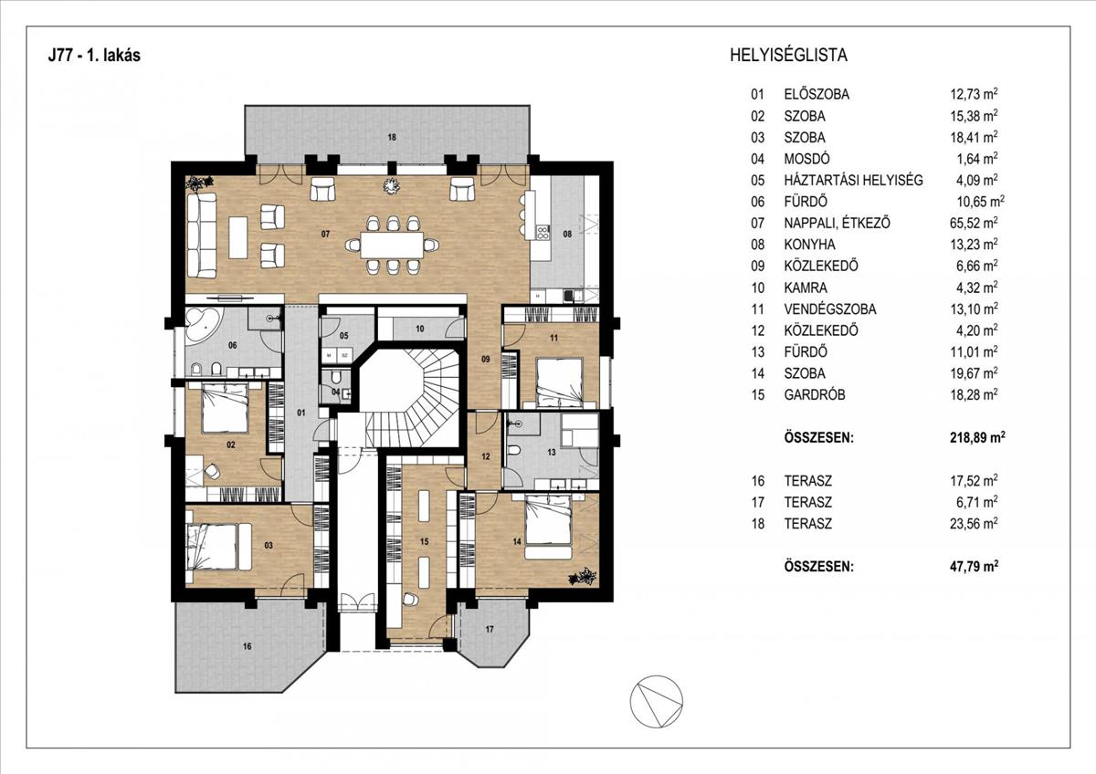 A lakás az épület záró szintjét foglalja el, így csak alsó szomszédok lesznek,  220 nm -es, amerikai - konyhás nappalival és 5 hálószobával, plusz egy gardróbbal rendelkezik, de akár leválasztható home office is kialakítható. a hatalamas (65 nm ) nappaliból a 24 nm -es teraszra jutunk ki, ahonnan elvehetlen örökpanoráma tárul elénk.