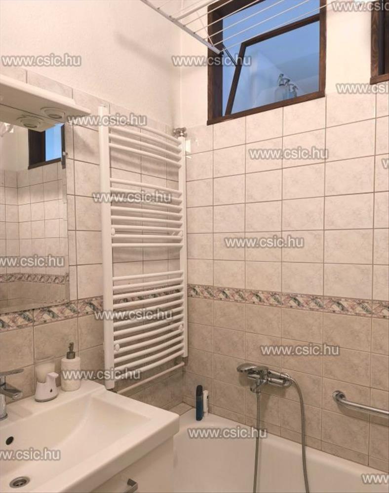 A lakás nyugati tájolású, ablakai a parkosított, kerítéssel körbevett belső kertre néznek, így világos, kifejezetten nyugodt hangulatú.