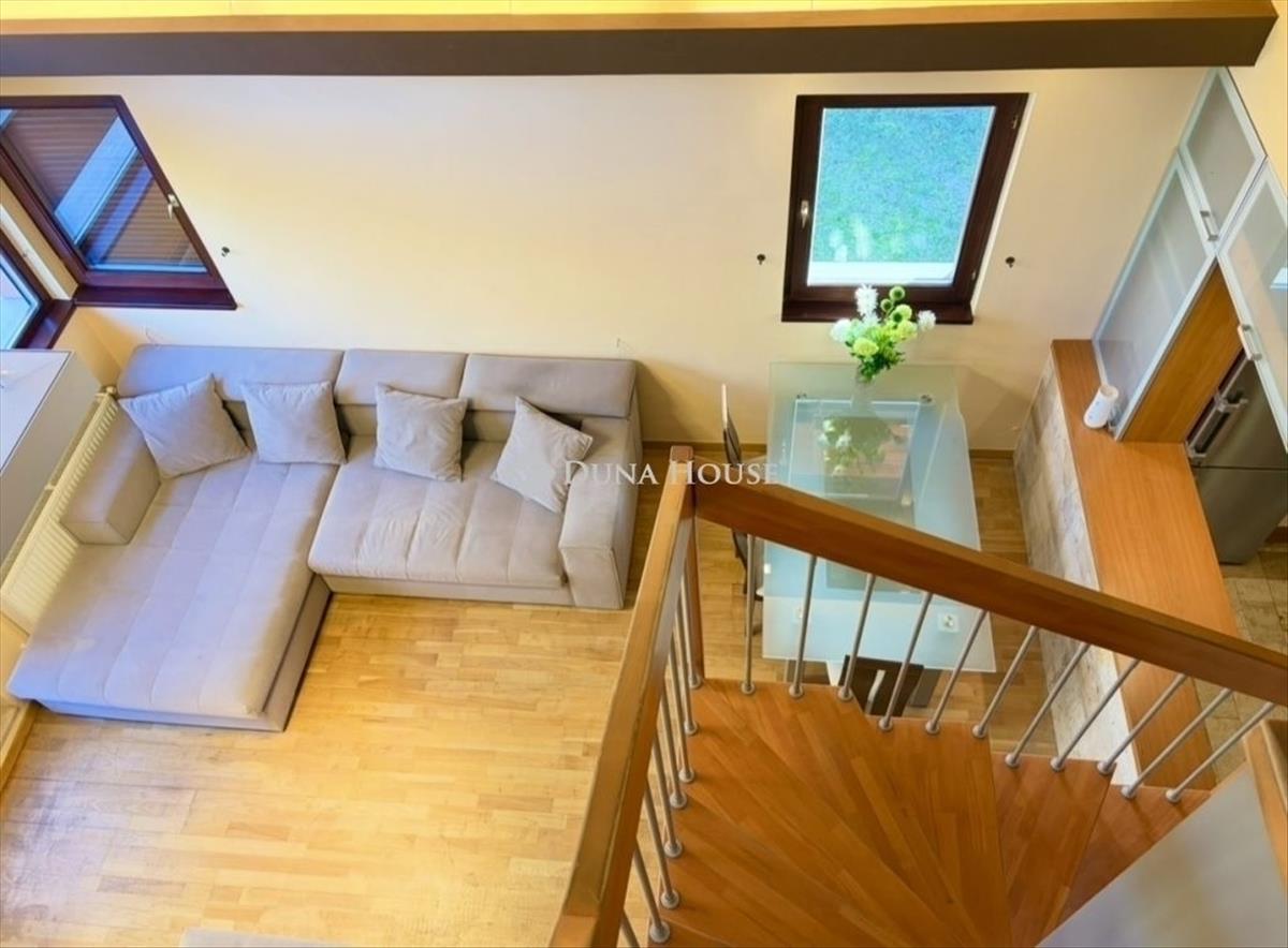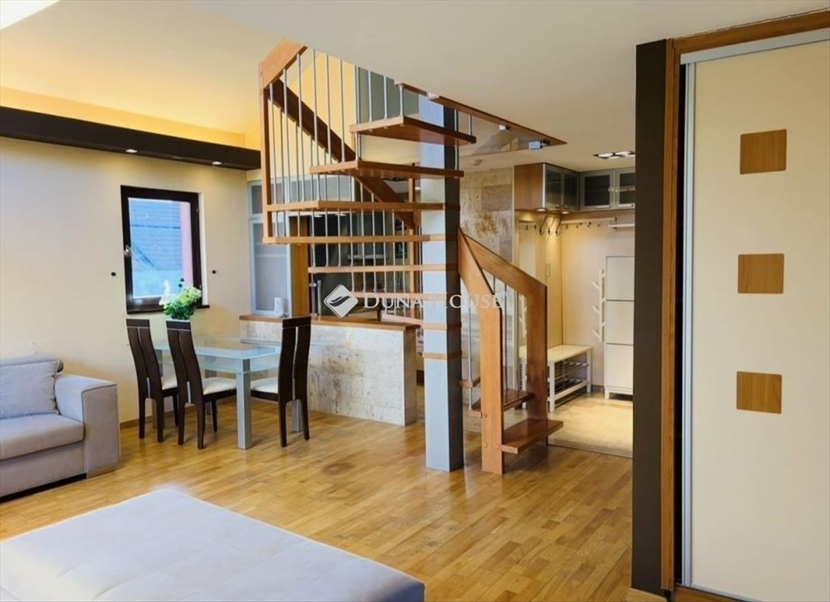 Loft hangulatú, világos lakás eladó a III. kerületben belső kertre néző teraszokkalBudapest III. kerületében Kaszásdűlőnél, egy három épületszárnyból álló, összesen 44 lakásos, rendezett társasházban kínálunk megvételre egy különleges adottságú ingatlant. Az ingatlan alapterülete 70 m². Loft jellegű belső tereinek köszönhetően tágas, modern és egyedi atmoszférát kínál. a lakás rendkívül csendes, ugyanakkor jól megközelíthető helyen található. Hatalmas ablakai a társasház parkosított belső kertjére néznek, így a lakótér egész nap világos, kellemes természetes fényben úszik. a teraszokról szintén az ősfás belső kert látványa tárul elénk, ami nyugodt, intim környezetet biztosít. Helyiségek elosztásaAlsó szint:nappali, konyha és előtér egy légtérbenwc + kézmosótárolóteraszA nappali egyik különleges hangulati eleme a működő kandalló, amely nemcsak esztétikai értéket képvisel, hanem a hűvösebb időszakban valódi, meghitt meleget is ad az otthonnak. Galéria szint:1 félszoba + teraszfürdőszoba WC-veltovábbi galéria rész, amely tárolásra alkalmasMinden szinten klíma található. Az ingatlan belső kialakítása igényes anyaghasználattal készült: a legtöbb helyiségben travertin mészkő burkolat található a padlón és a falakon is. a nappali parkettás, míg a galéria szőnyegezett, ami meleg, otthonos érzetet biztosít. a közös költség: 26. 000 Ft/ hóFűtés: 15. 000 Ft/hóA kazáncsere megtörtént a közelmúltban. a lakáshoz tartozik egy közös földszinti tároló pl. Biciklinek, babakocsinak. Külön vásárolható 2 db parkolóhely a teremgarázsban. 5 Mill Ft / parkolóhelyA ingatlan 1/1 tulajdon, tehermentes, azonnal birtokba vehető. Az ingatlan Óbudán, a Kaszásdűlő térségében helyezkedik el, kiváló közlekedési kapcsolatokkal. a H5-ös hév Kaszásdűlő megállója mindössze néhány perc sétára található, amellyel a belváros, például a Batthyány tér gyorsan és kényelmesen elérhető. a Szentendrei úton közlekedő buszjáratok, valamint a környék további buszvonalai szintén biztosítják a rugalmas tömegközlekedést, így a város több pontja könnyen megközelíthető innen. Ez a lakás ideális választás lehet azok számára, akik csendes, zöld környezetben keresnek egyedi hangulatú, világos otthont.