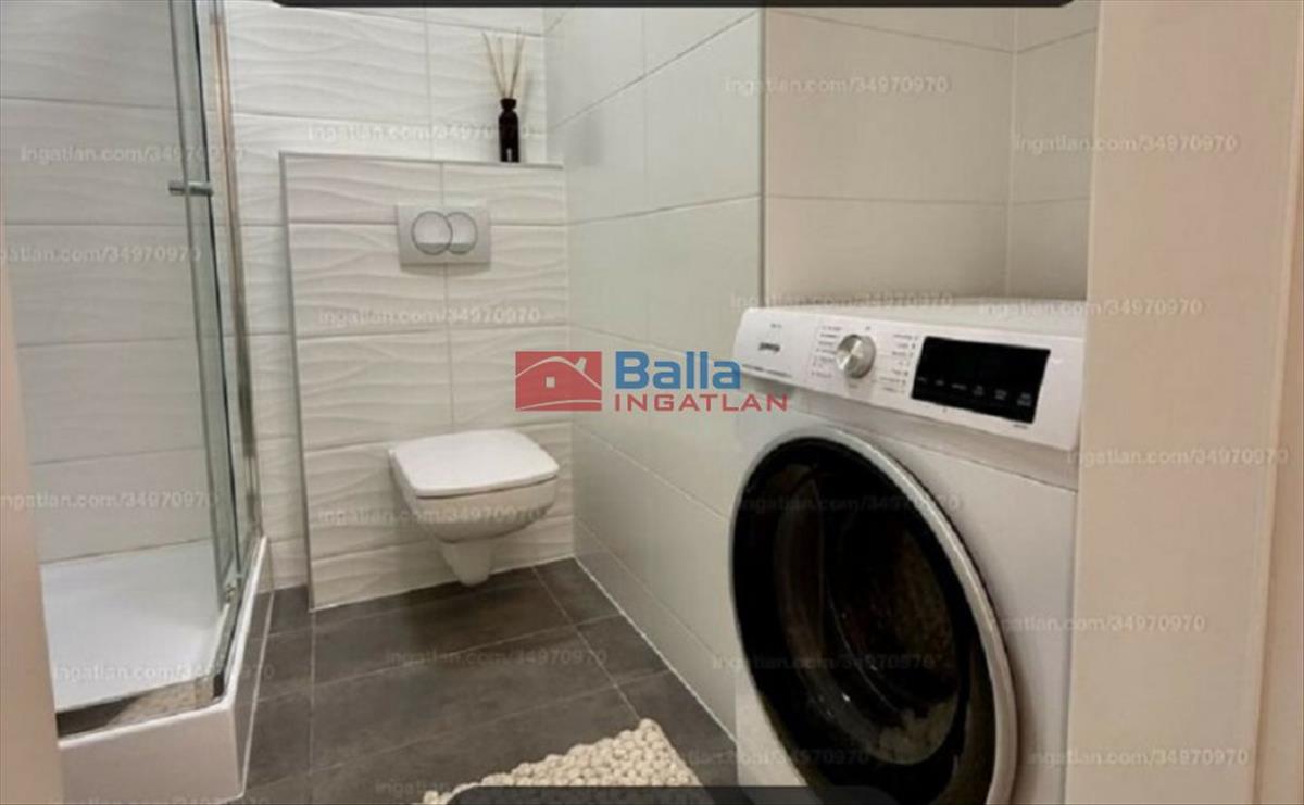 A fürdőszobában zuhanyzó, Wc, led világítással ellátott kinyitható tükrös szekrény, fiókos mosdó alatti szekrény, valamint a mosó- és szárítógép található.