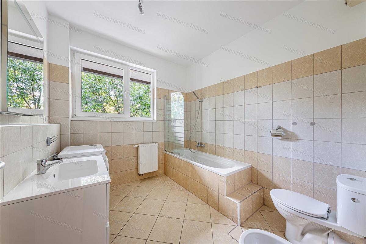 Fényes, ablakos fürdőszoba, amely kádas, WC-vel és bidével felszerelt.